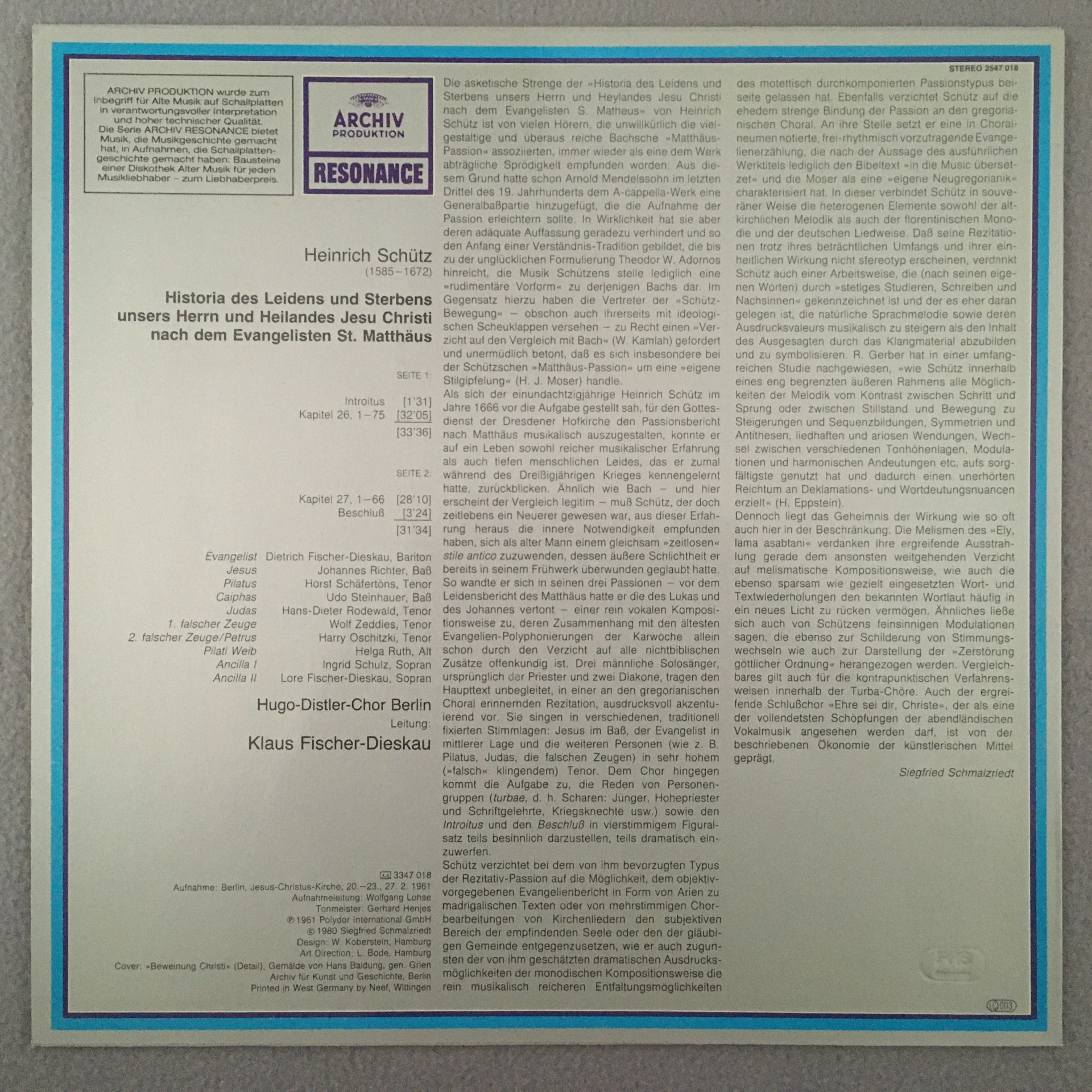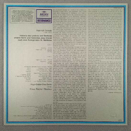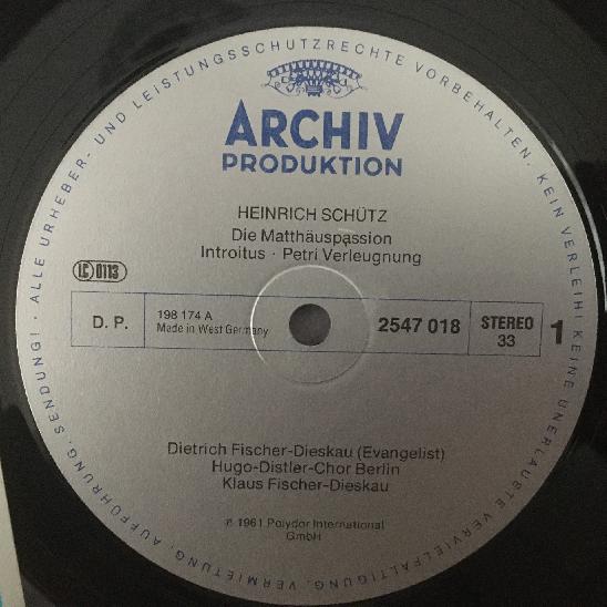 R467 Schütz St. Matthew Passion Fischer-Dieskau DGG Archiv 2547 018 Stereo
