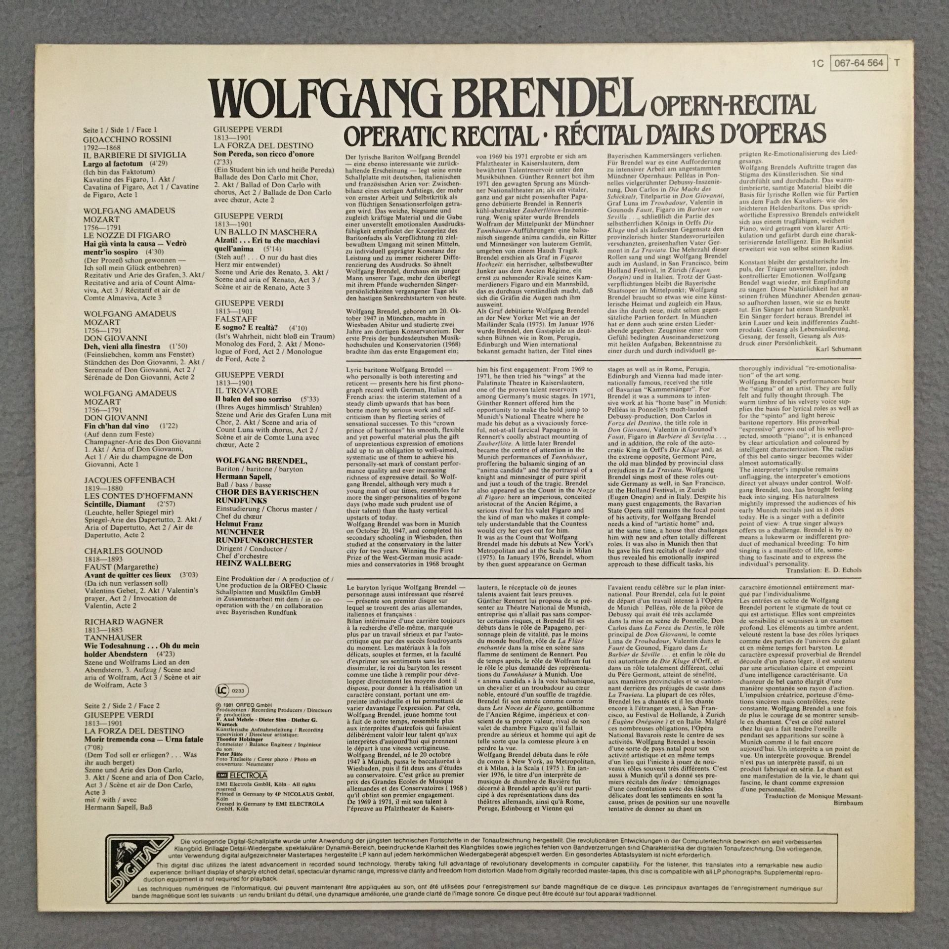 R525 Brendel Opera Recital Mozart Verdi EMI 1C 067-64 564 T Digital Stereo