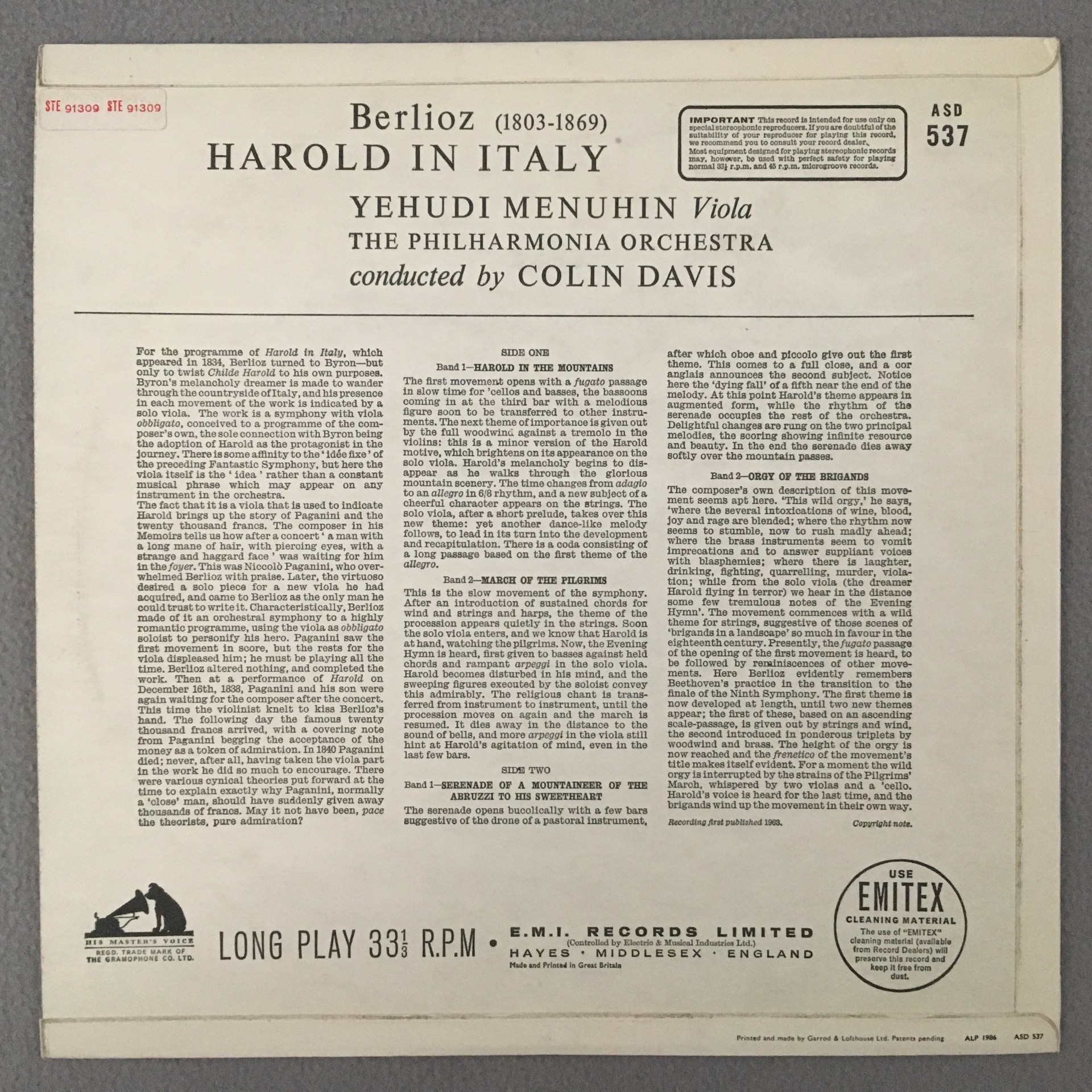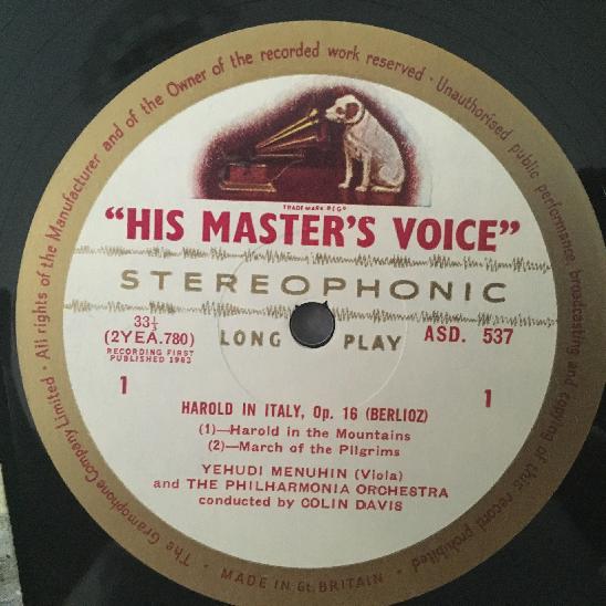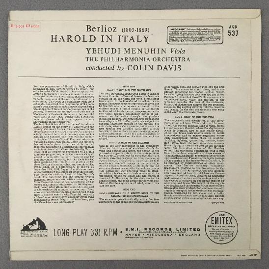 R556 Berlioz Harold in Italy Menuhin / Violin Davis LPO HMV ASD 537 Stereo ED1