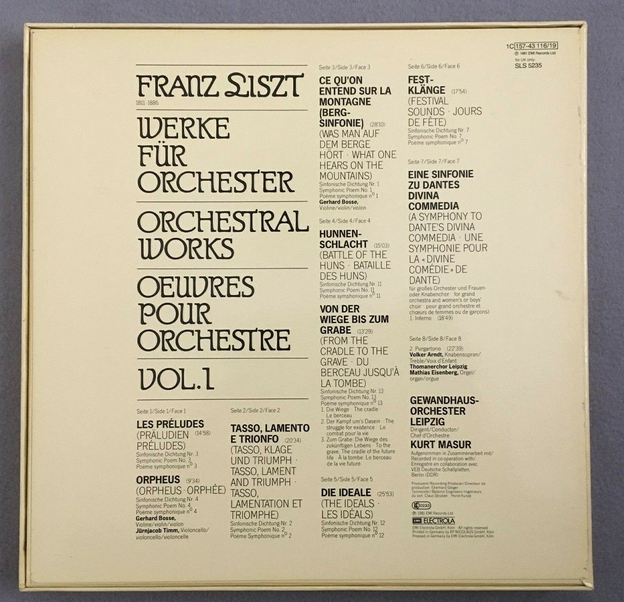 B682 Liszt Orchestral Works Vol.1 Masur 4LP EMI 1C 157-43 116/19 Stereo