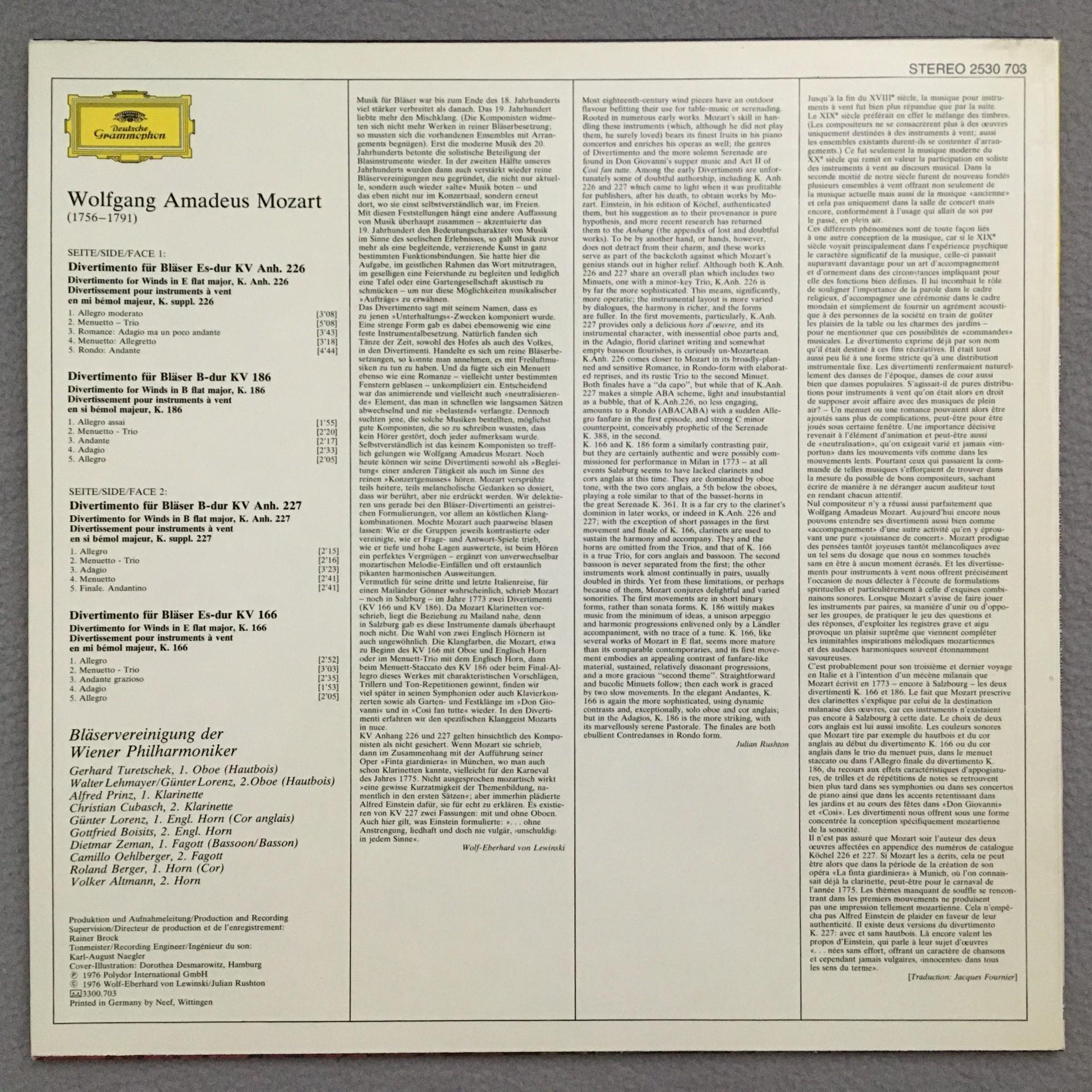 Q711 Mozart Divertimenti for Winds Wind Ensemble VPO DGG 2530 703 Stereo