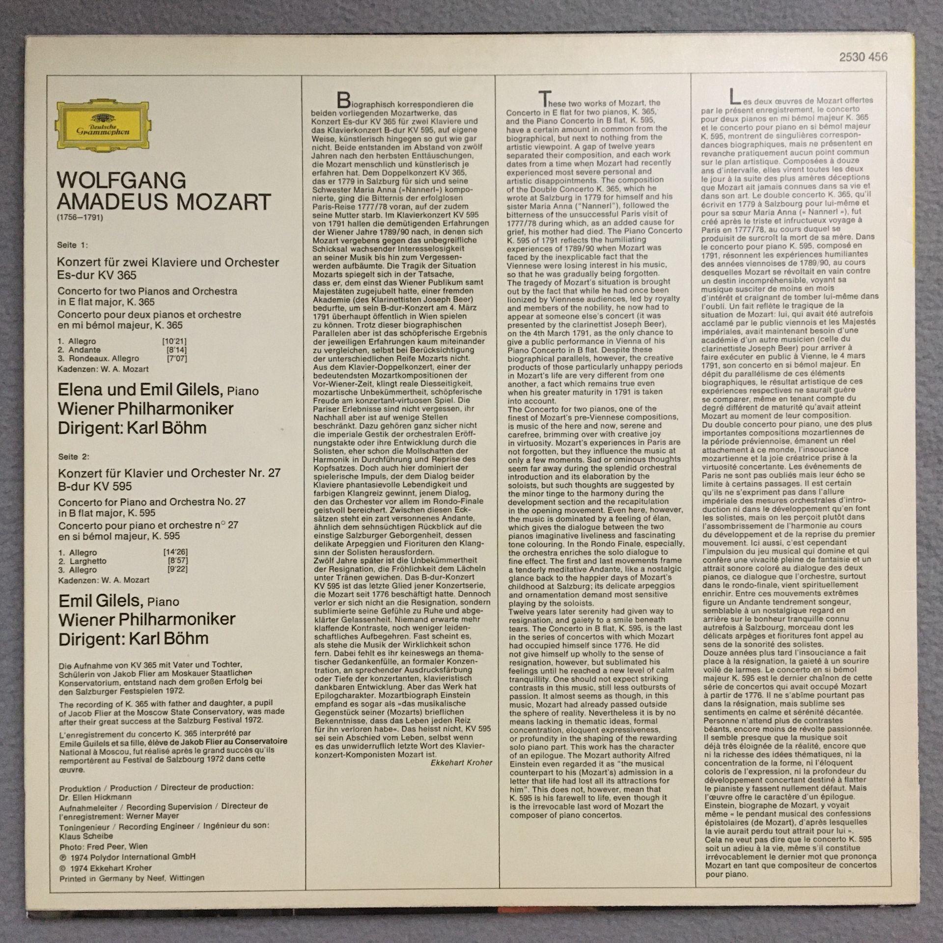 Q734 Mozart Piano Concertos E. & E. Gilels Bohm VPO DGG 2530 456 Stereo