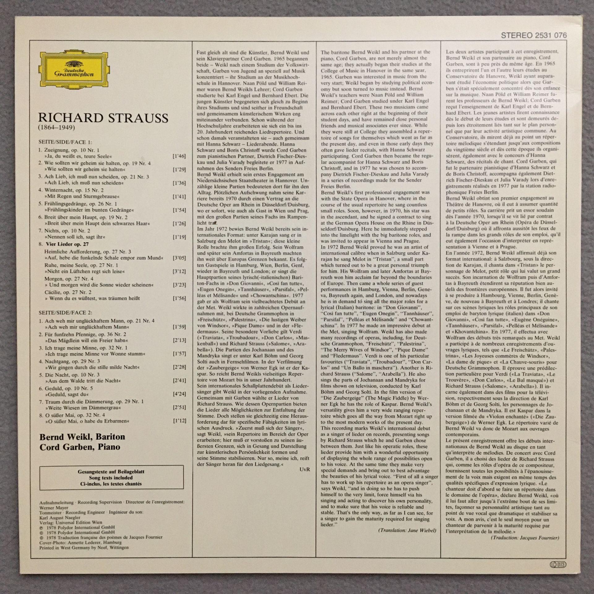 Q775 R. Strauss Songs Weikl Garben Piano DGG 2531 076 Stereo