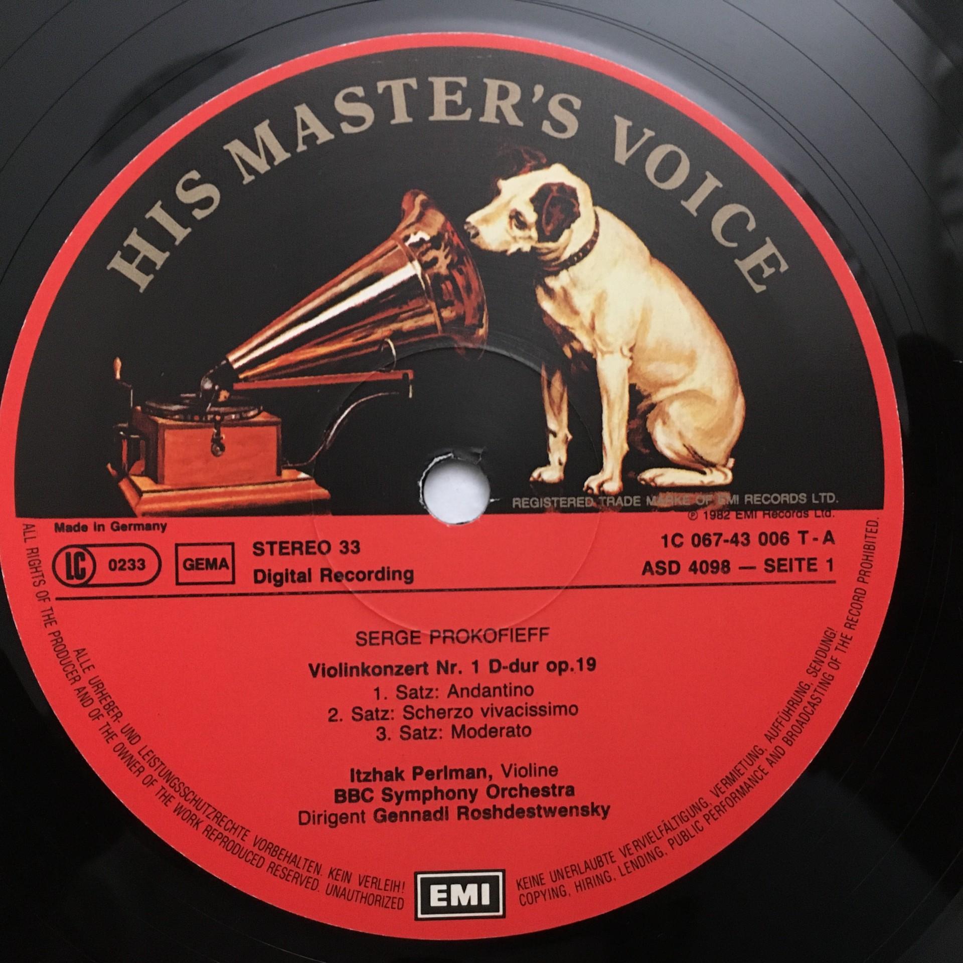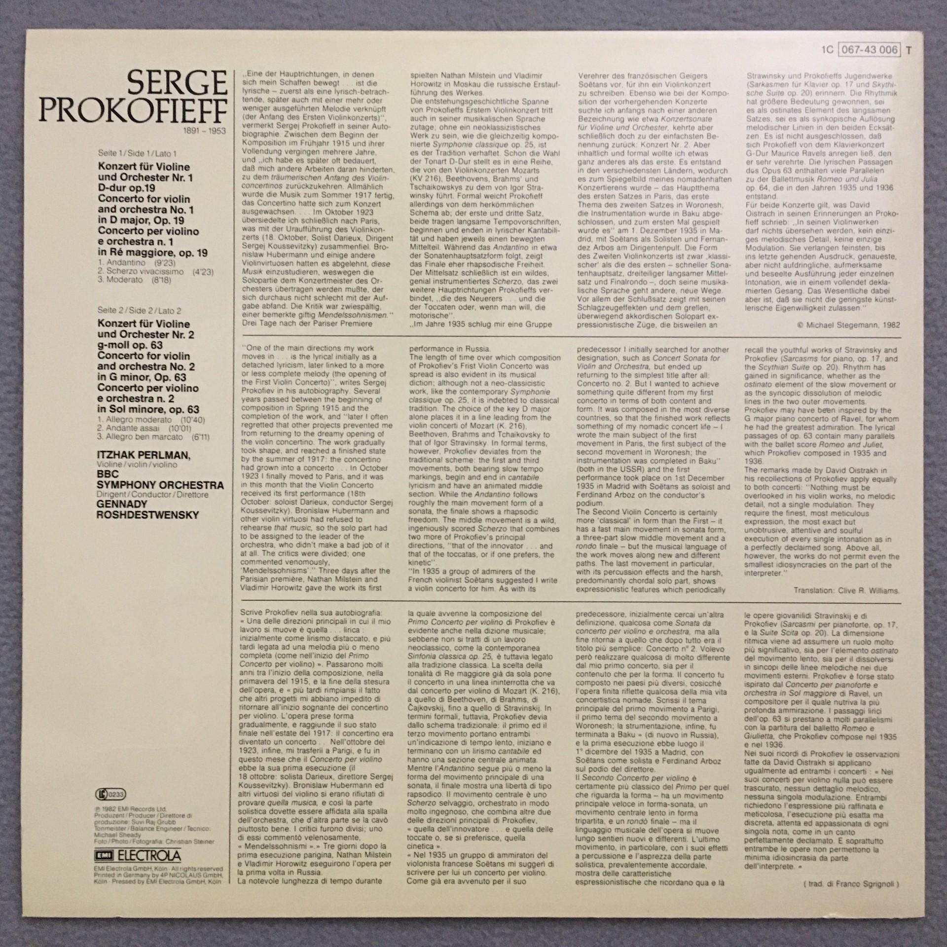 Q833 Prokofiev Violin Concertos Perlman Rozhdestvensky EMI 1C 067-43 006 Digital
