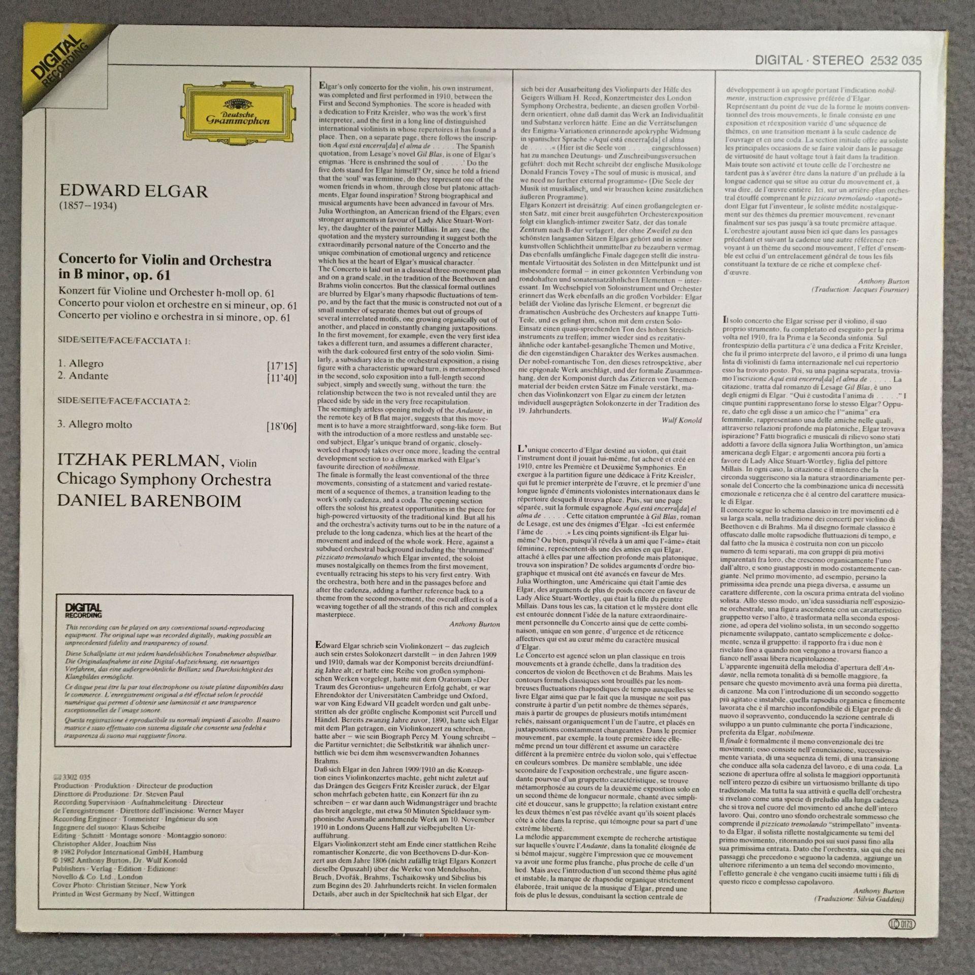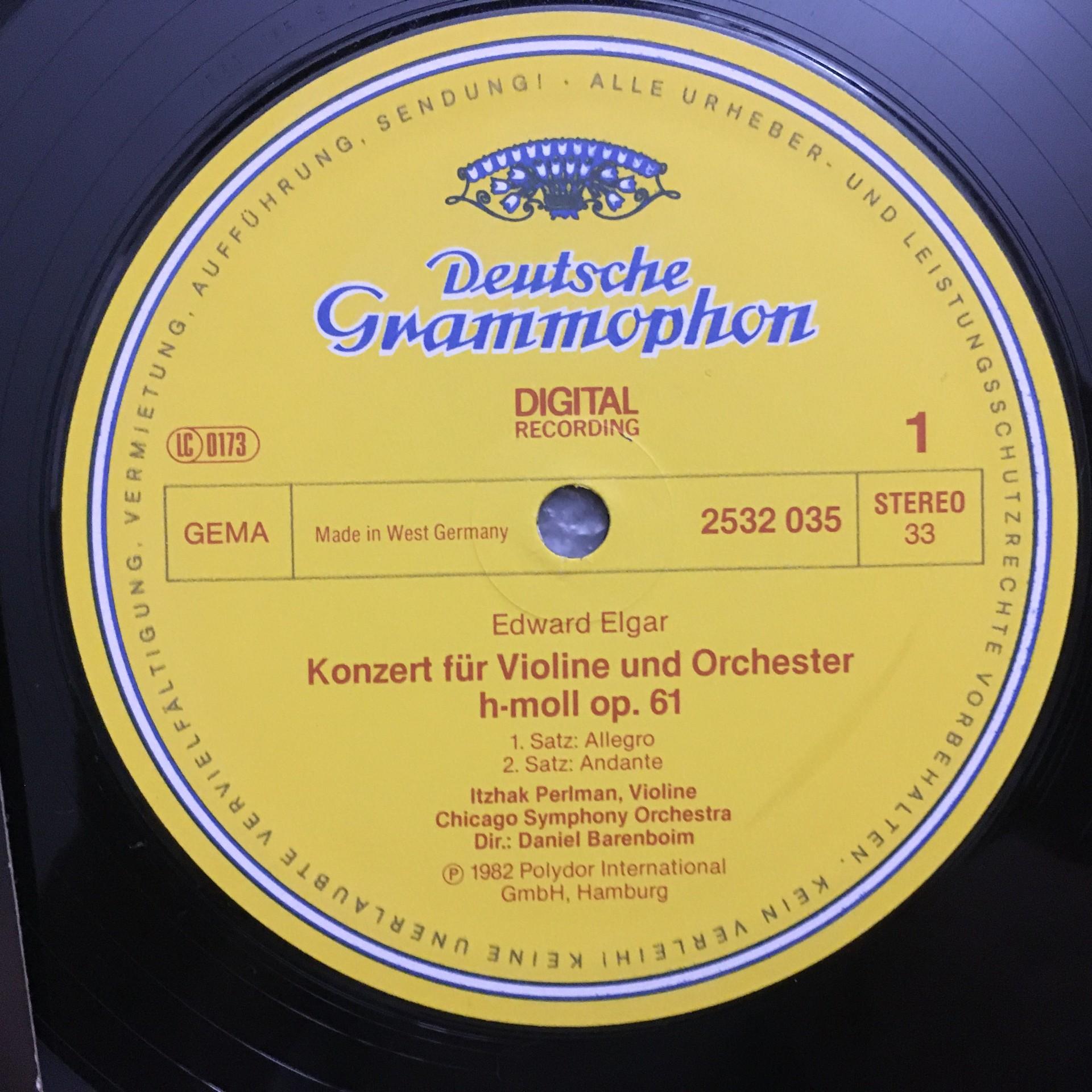 Q933 Elgar Violin Concerto Perlman Barenboim DGG 2532 035 Digital Stereo