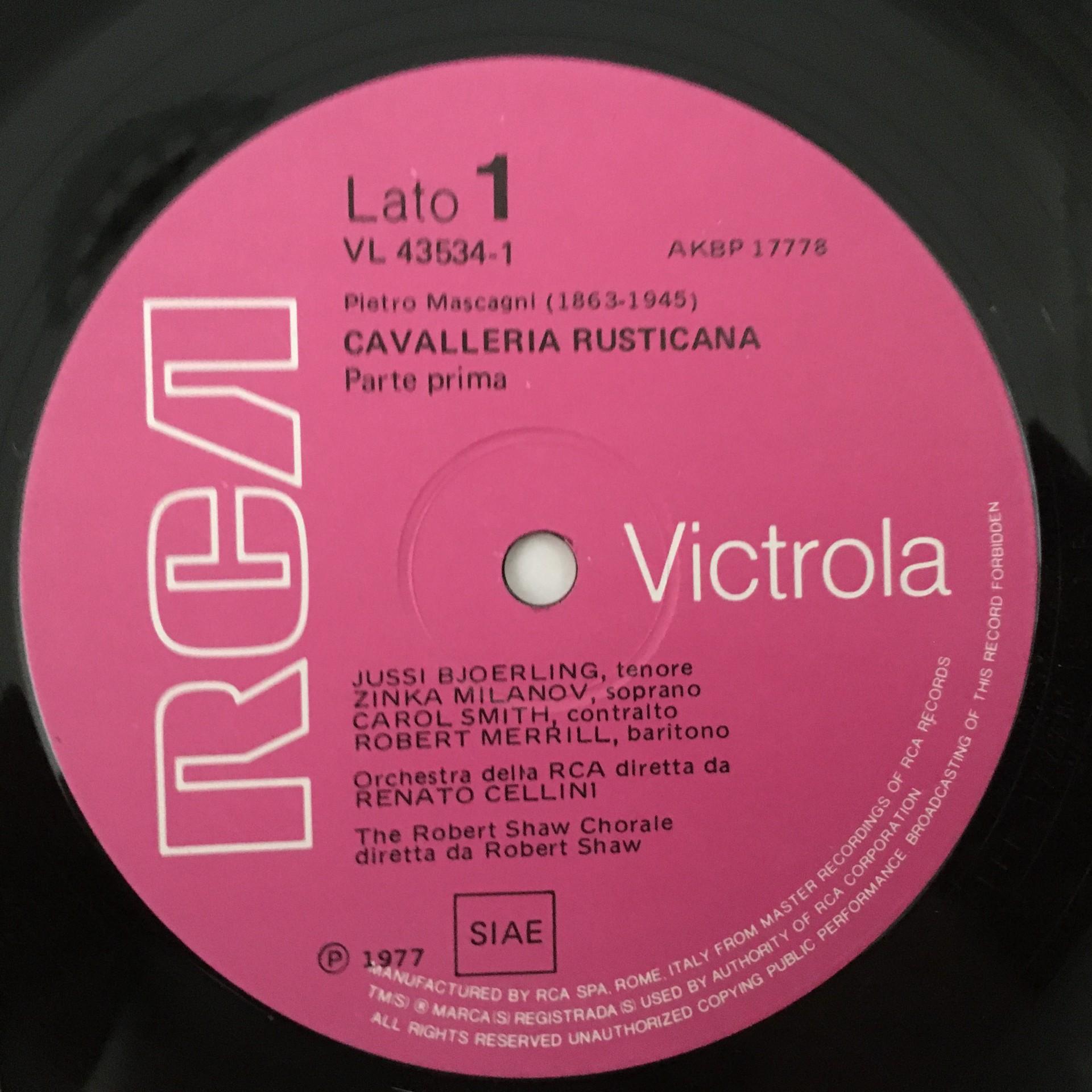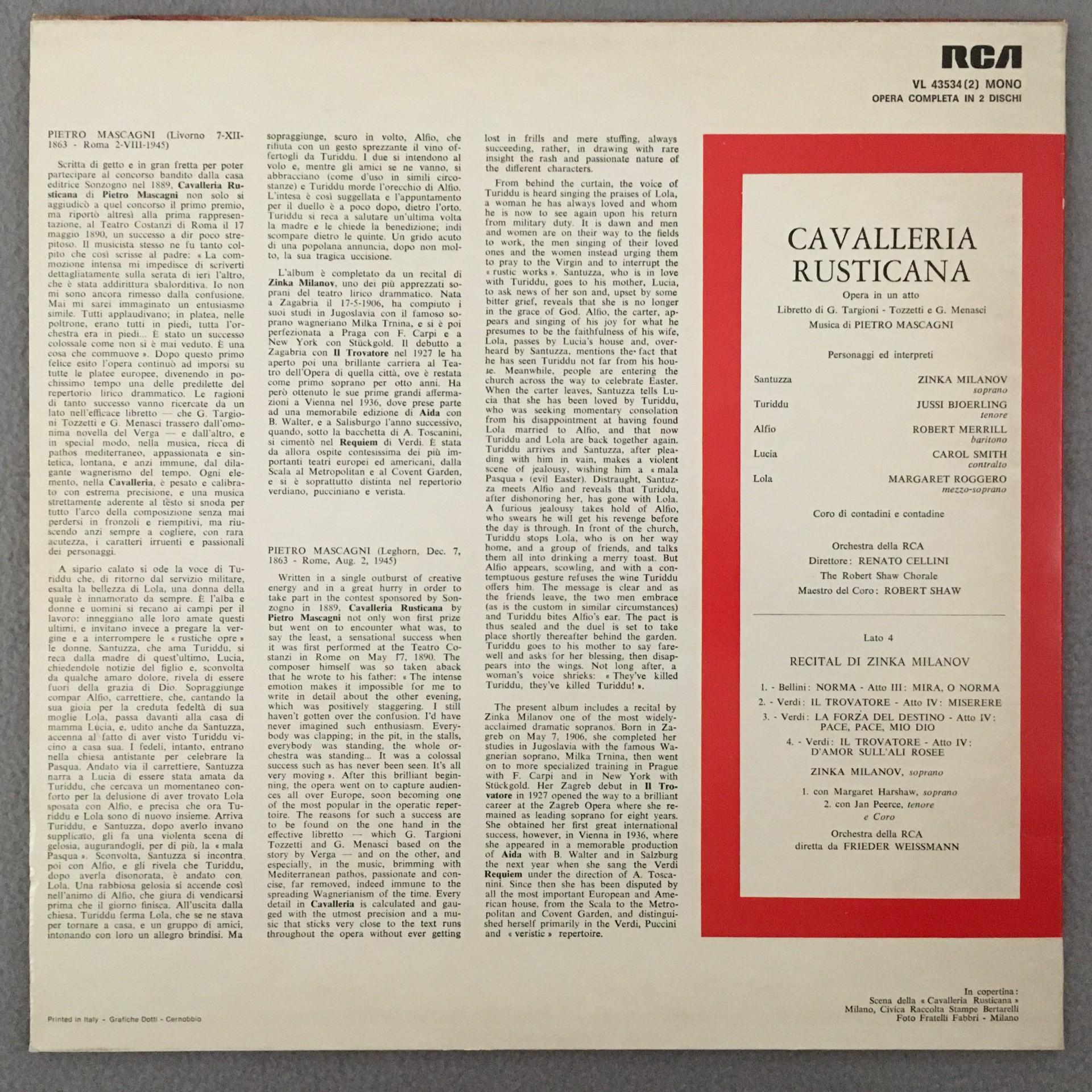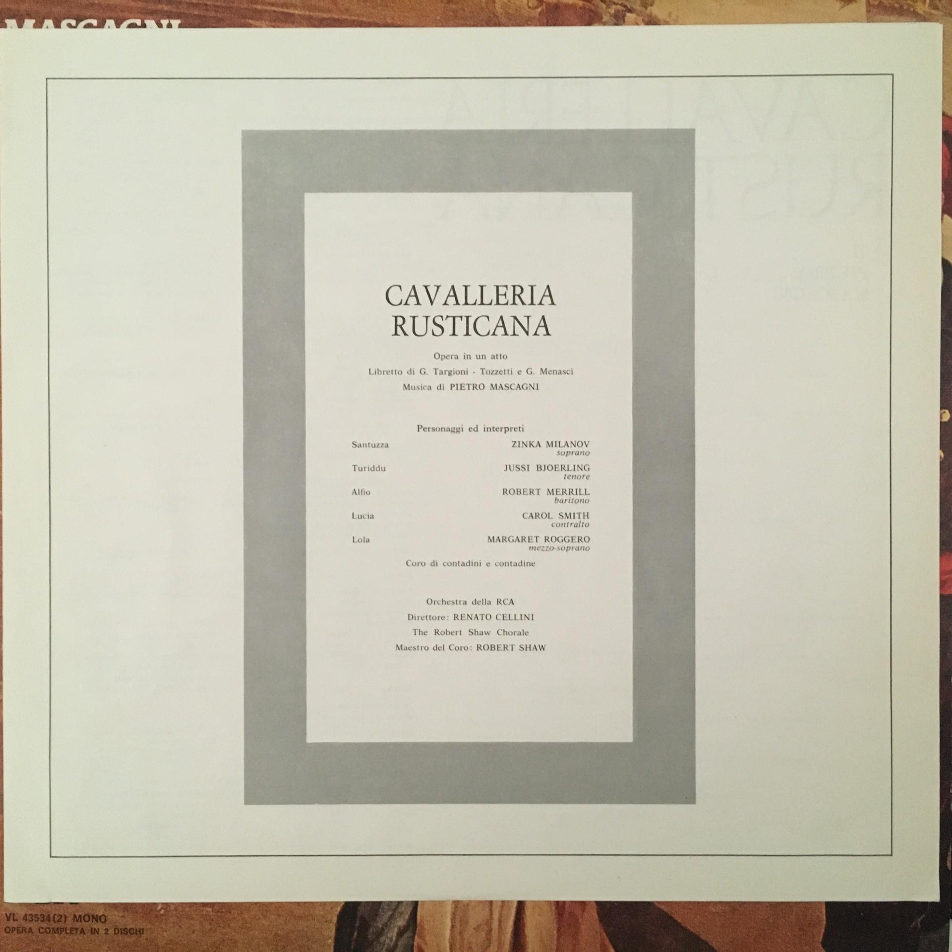 T062 Mascagni Cavalleria Rusticana Milanov Merrill Cellini 2LP RCA VL 43534