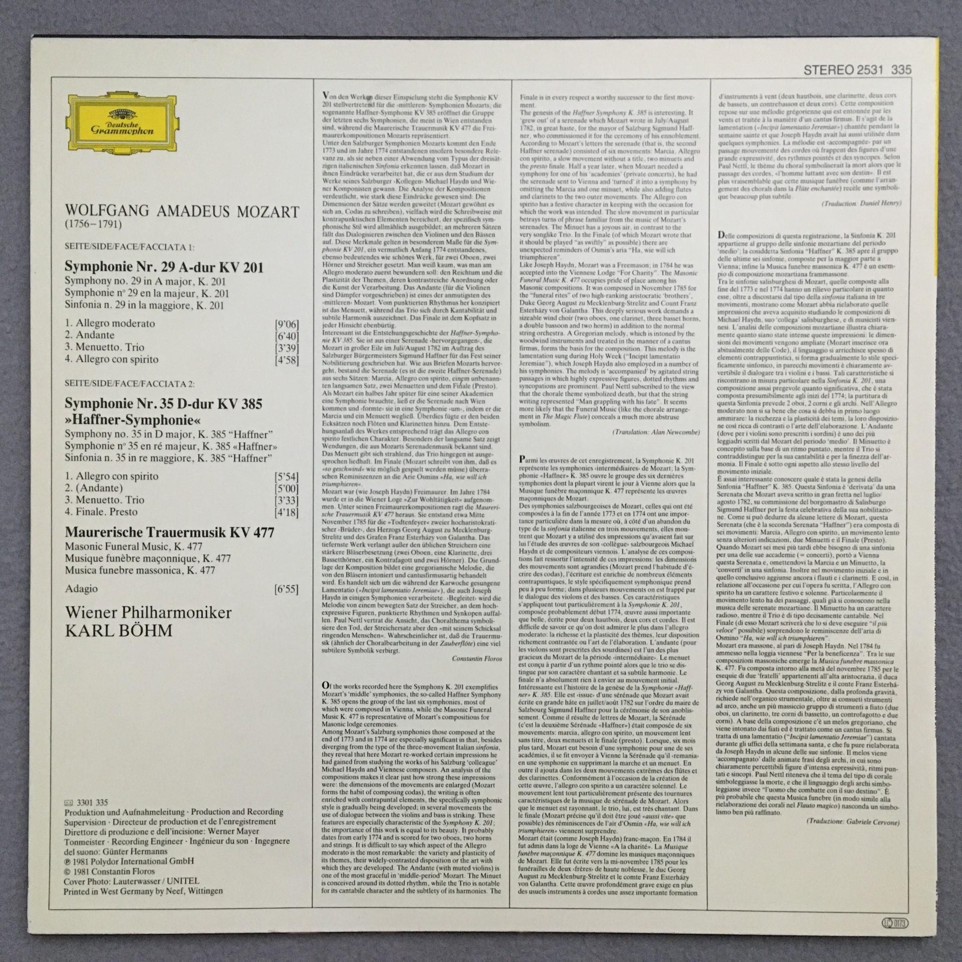 T183 Mozart Symphonies No. 29 & No.35 Bohm VPO DGG 2531 335 Stereo