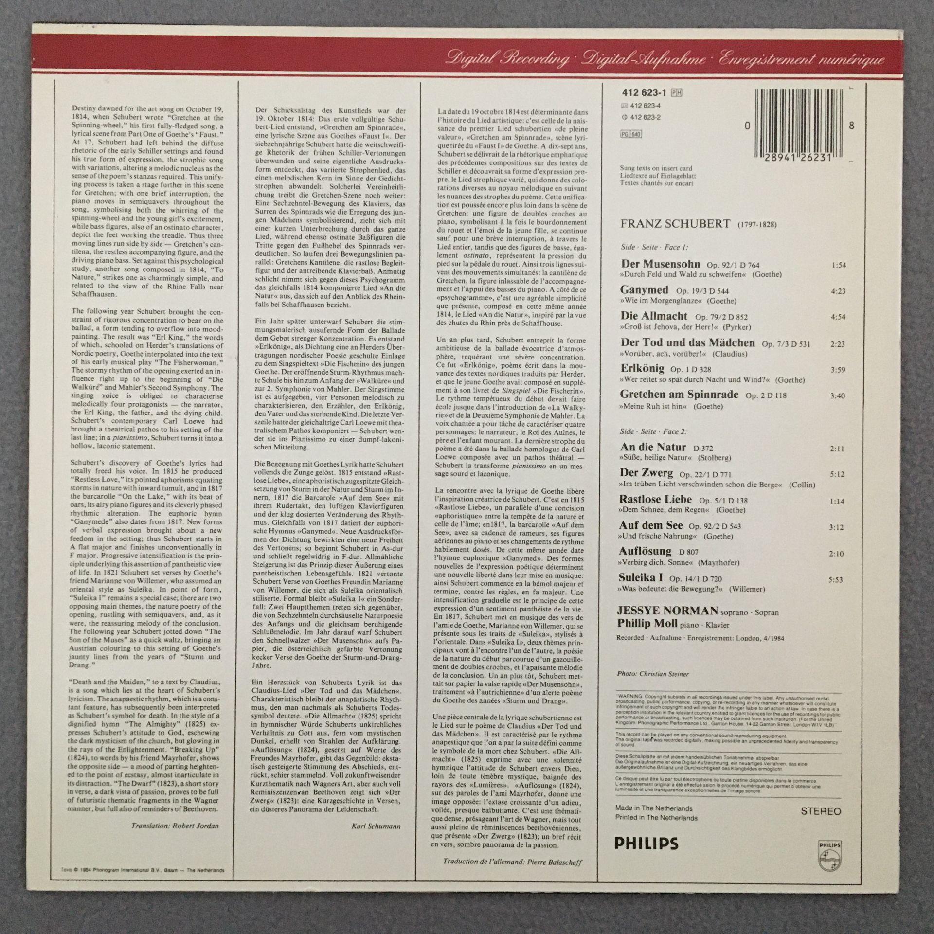 T204 Schubert Songs Norman Moll Piano Philips 412 623-1 Digital Stereo