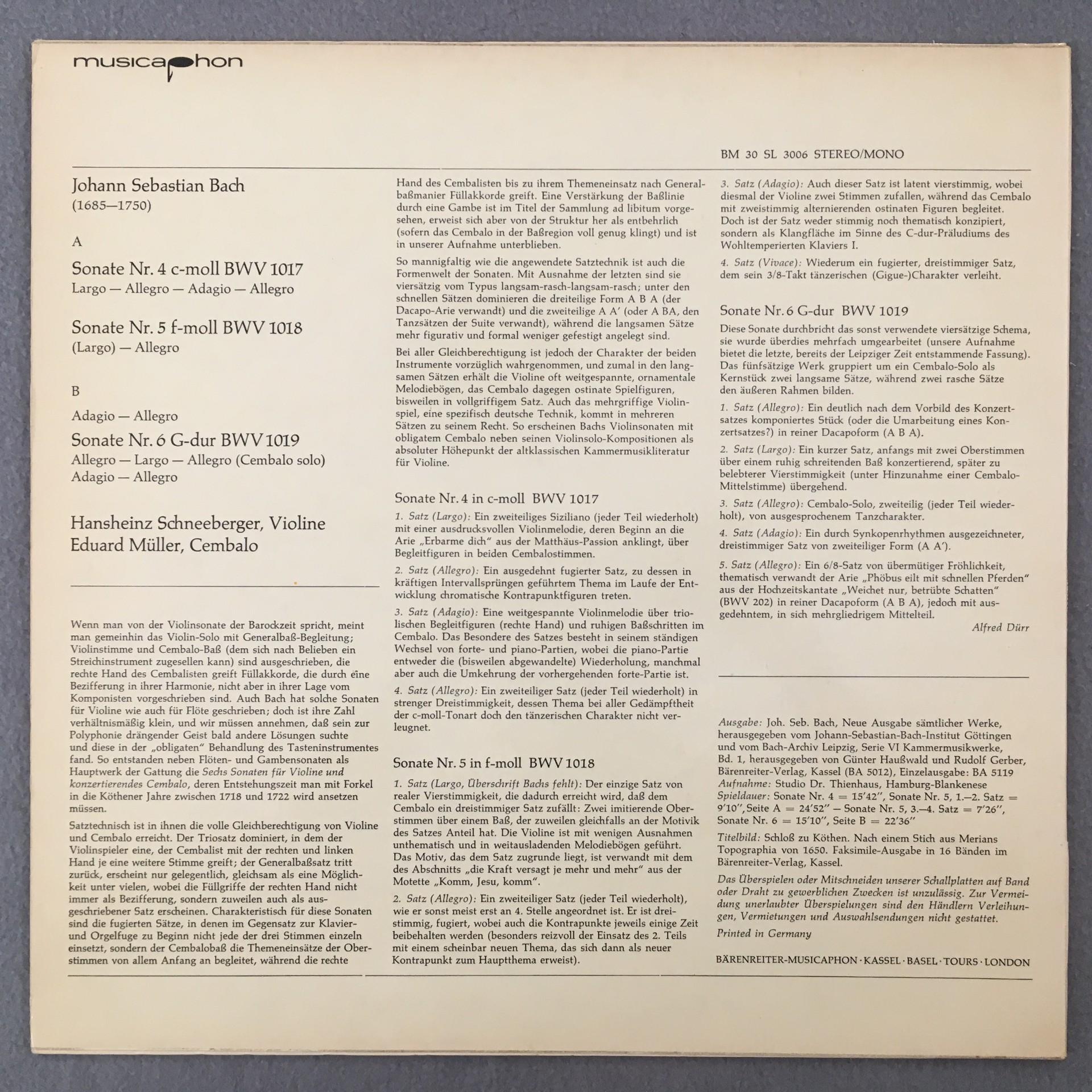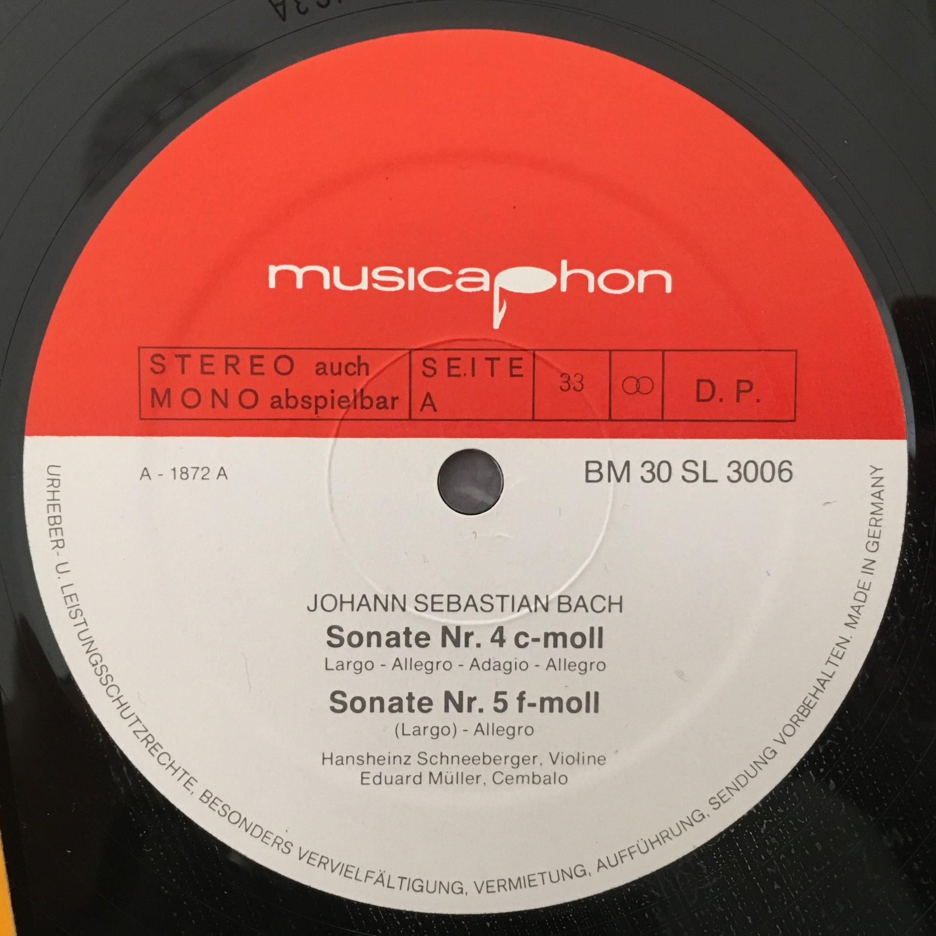 T334 Bach 6 Violin Sonatas Schneeberger Müller Musicaphon BM 30 SL 3006 Stereo