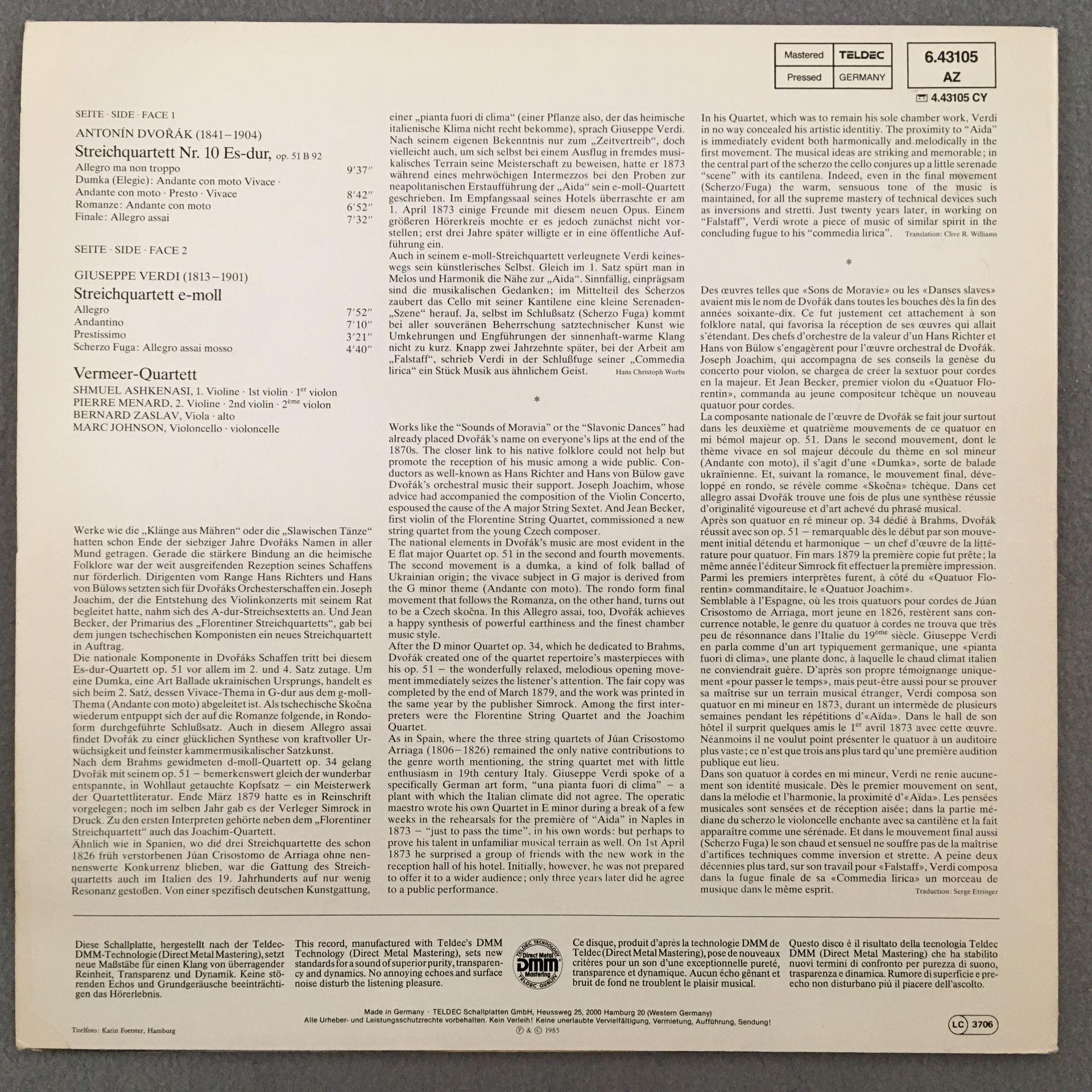 T352 Dvorak Verdi String Quartets Vermeer Quartet Teldec 6.43105 AZ Dig Stereo