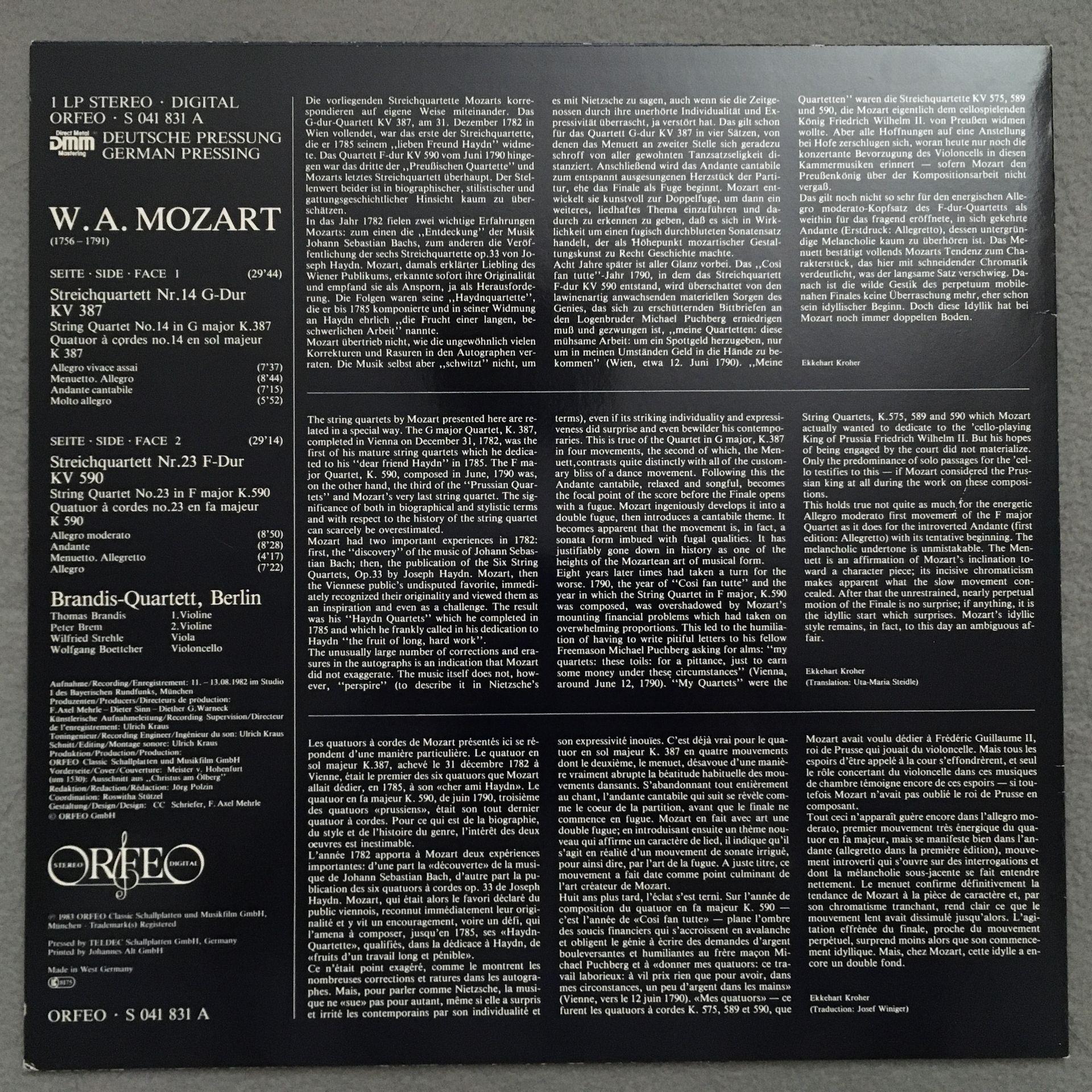 T357 Mozart String Quartets Brandis-Quartett Boettcher Orfeo S 041 831 A Dig St