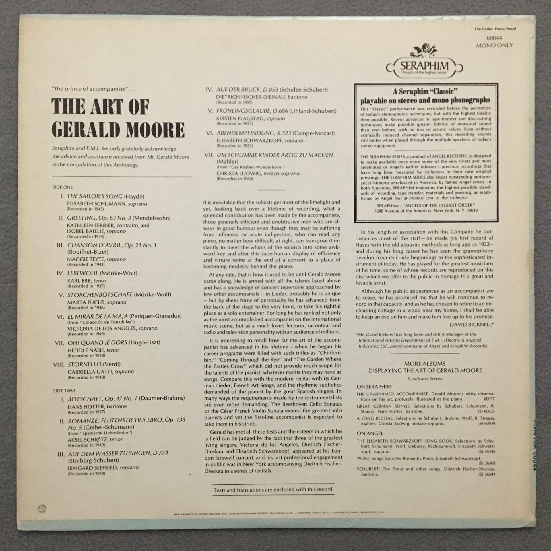 T423 The Art of Gerald Moore Fischer-Dieskau Ludwig Ferrier Seraphim 60044