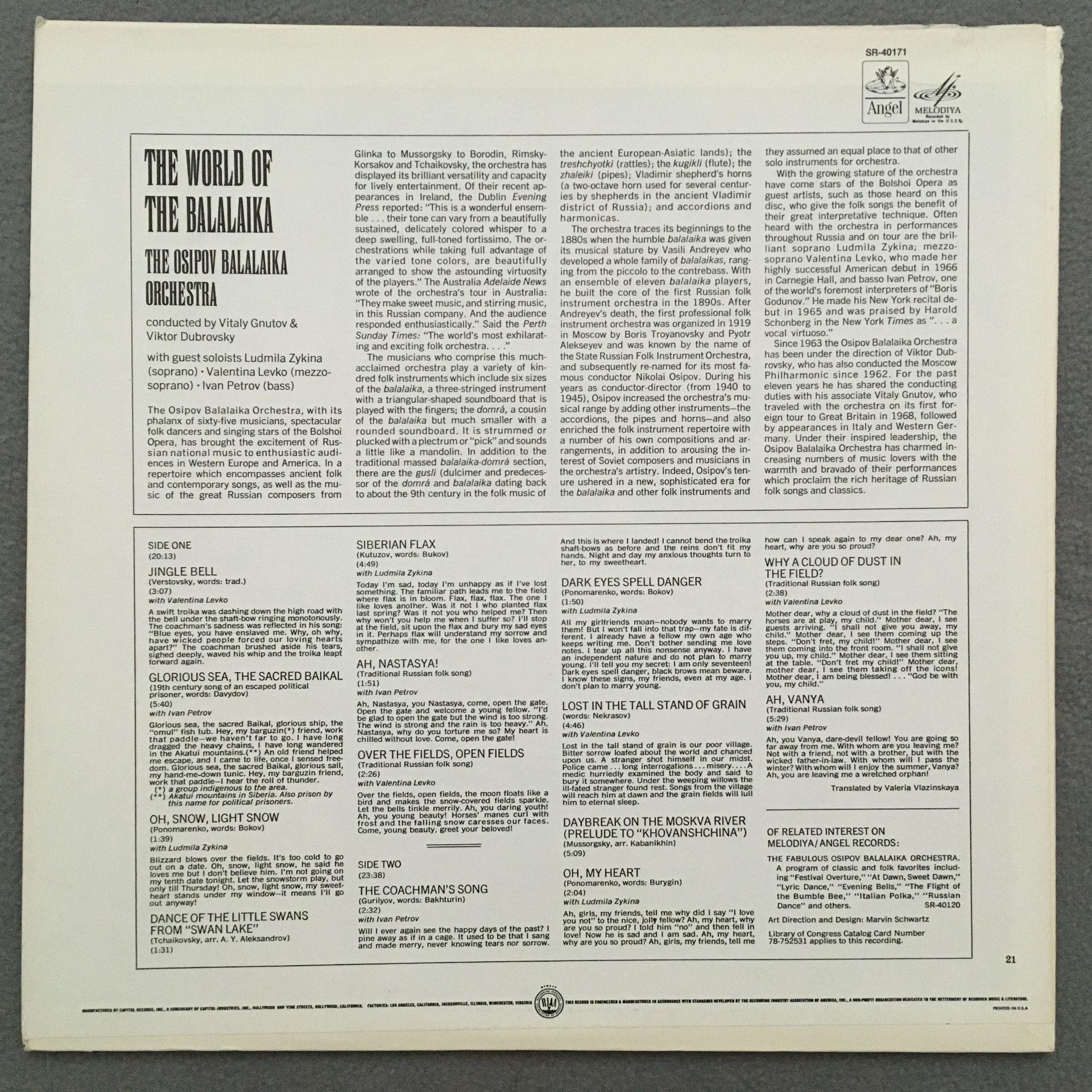 T605 The World of Balalaika Russian Folk Songs Zykina Melodiya SR-40171 Stereo