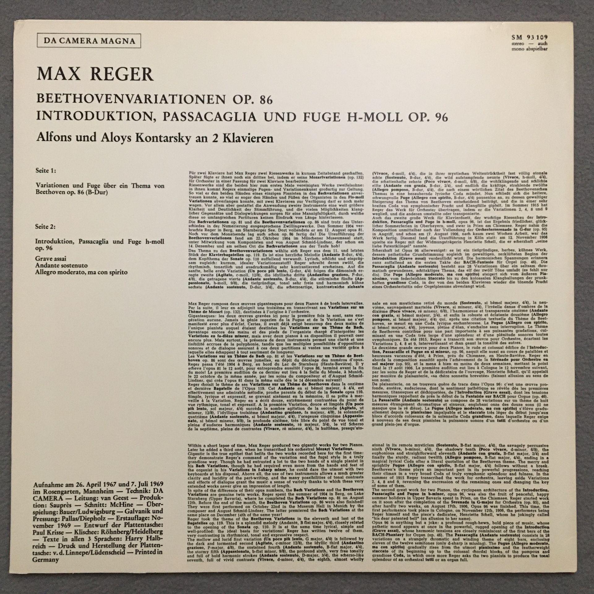 T620 Reger Chamber Music A. & A. Kontarsky Da Camera Magna SM 93109