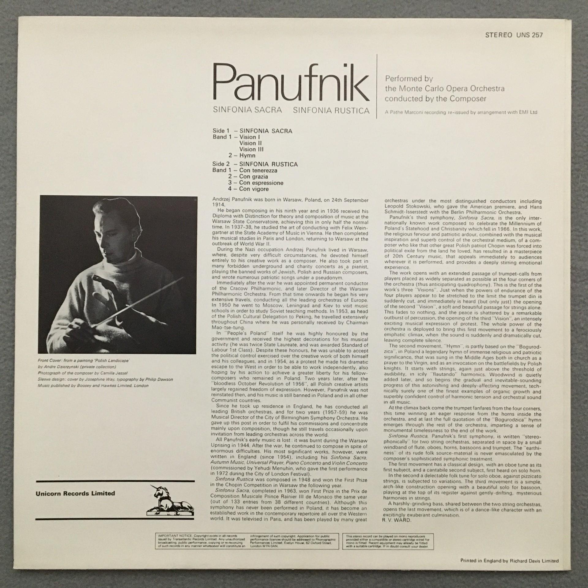 T649 Panufnik Sinfonia Sacra Sinfonia Rustica Unicorn UNS 257 Stereo