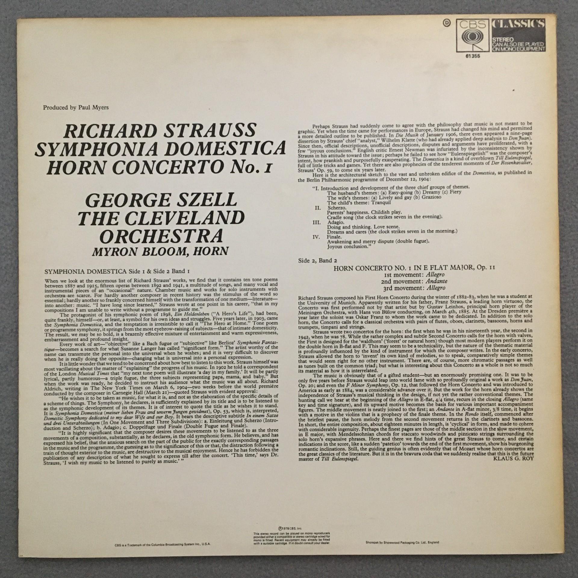 T711 R. Strauss Symphonia Domestica Horn Concerto Bloom Szell CBS 61 355 Stereo