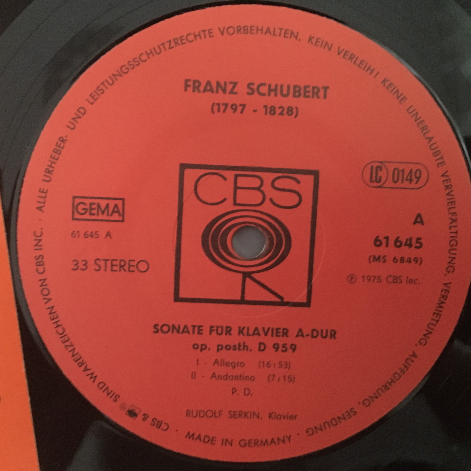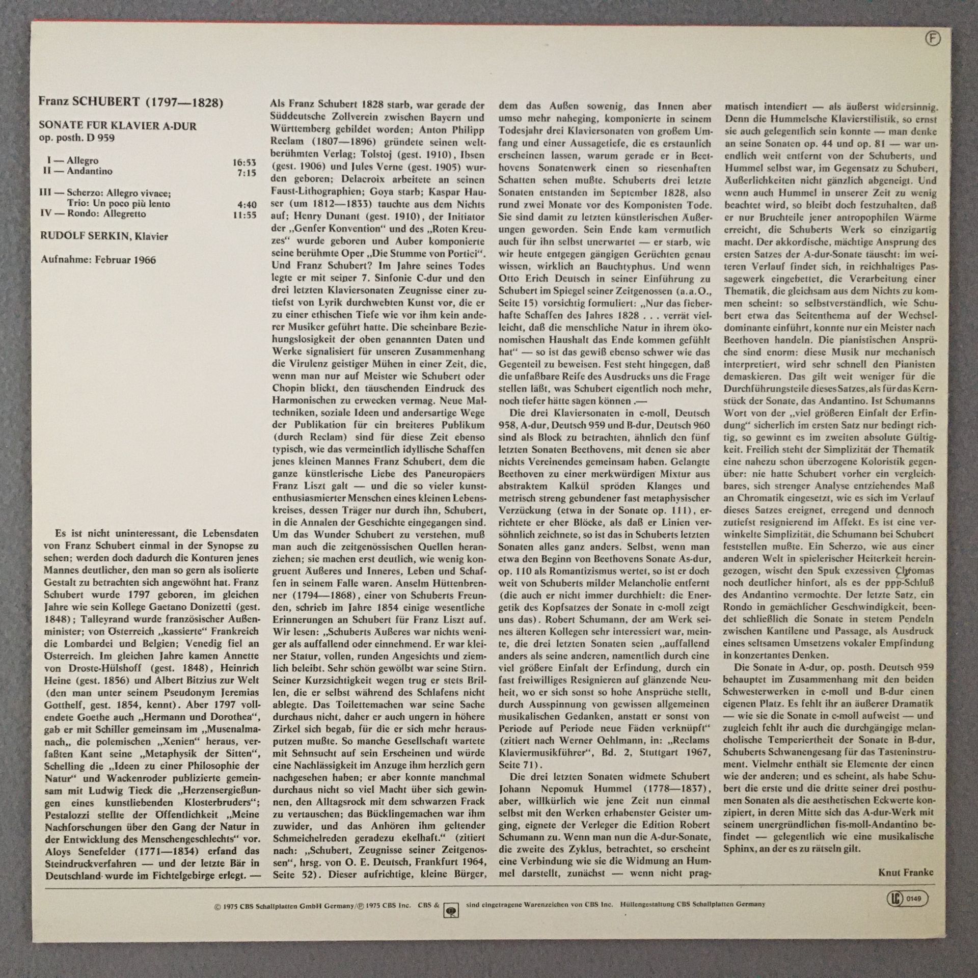 J293 Schubert Sonata for Piano Rudolf Serkin CBS 61645 Stereo