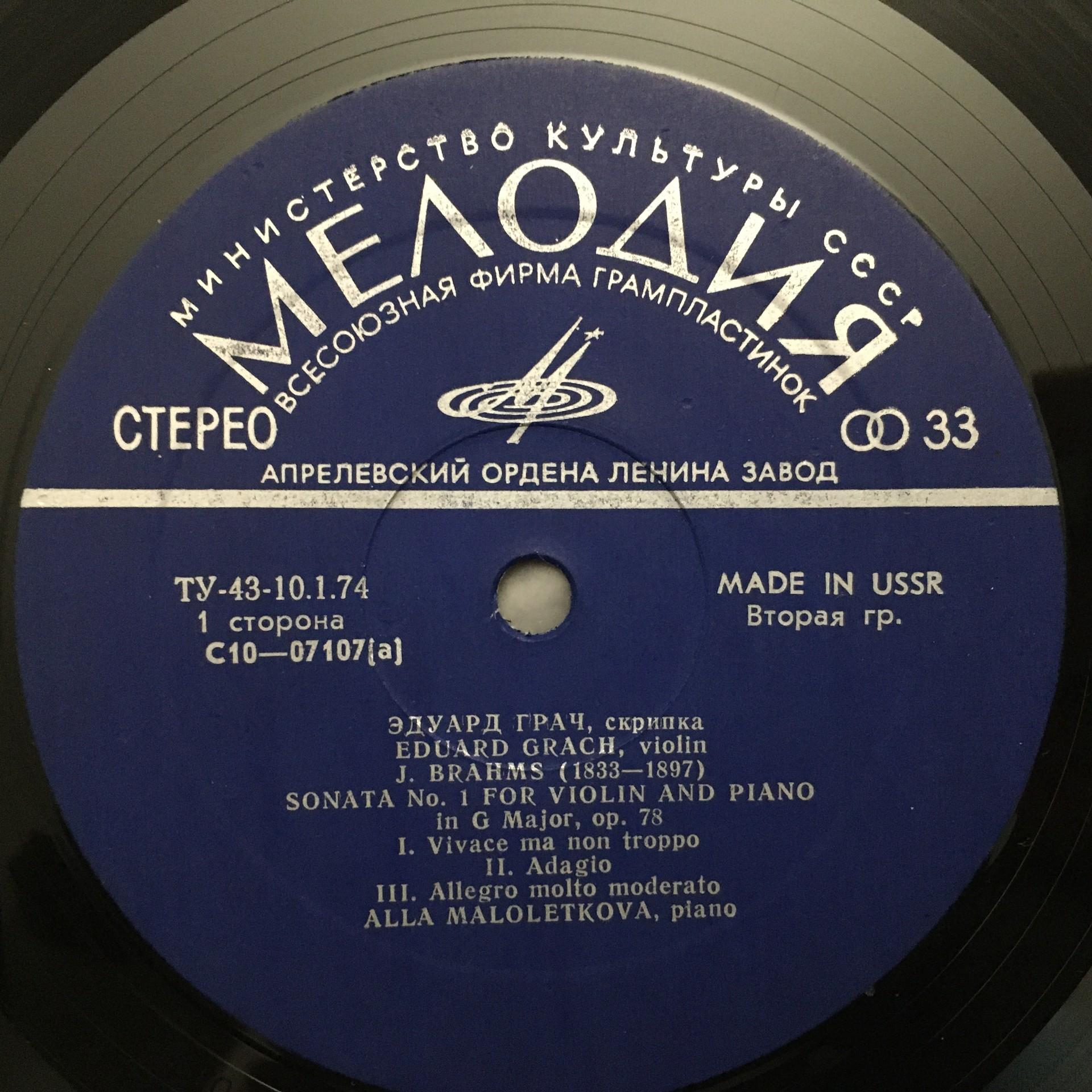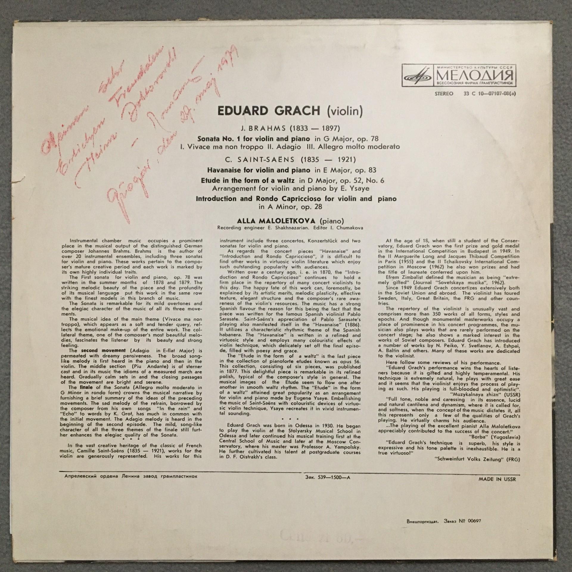 T763 Brahms Sonata Saint-Saens Grach Violin Maloletkova Melodiya 33 C 10-07107-08 St