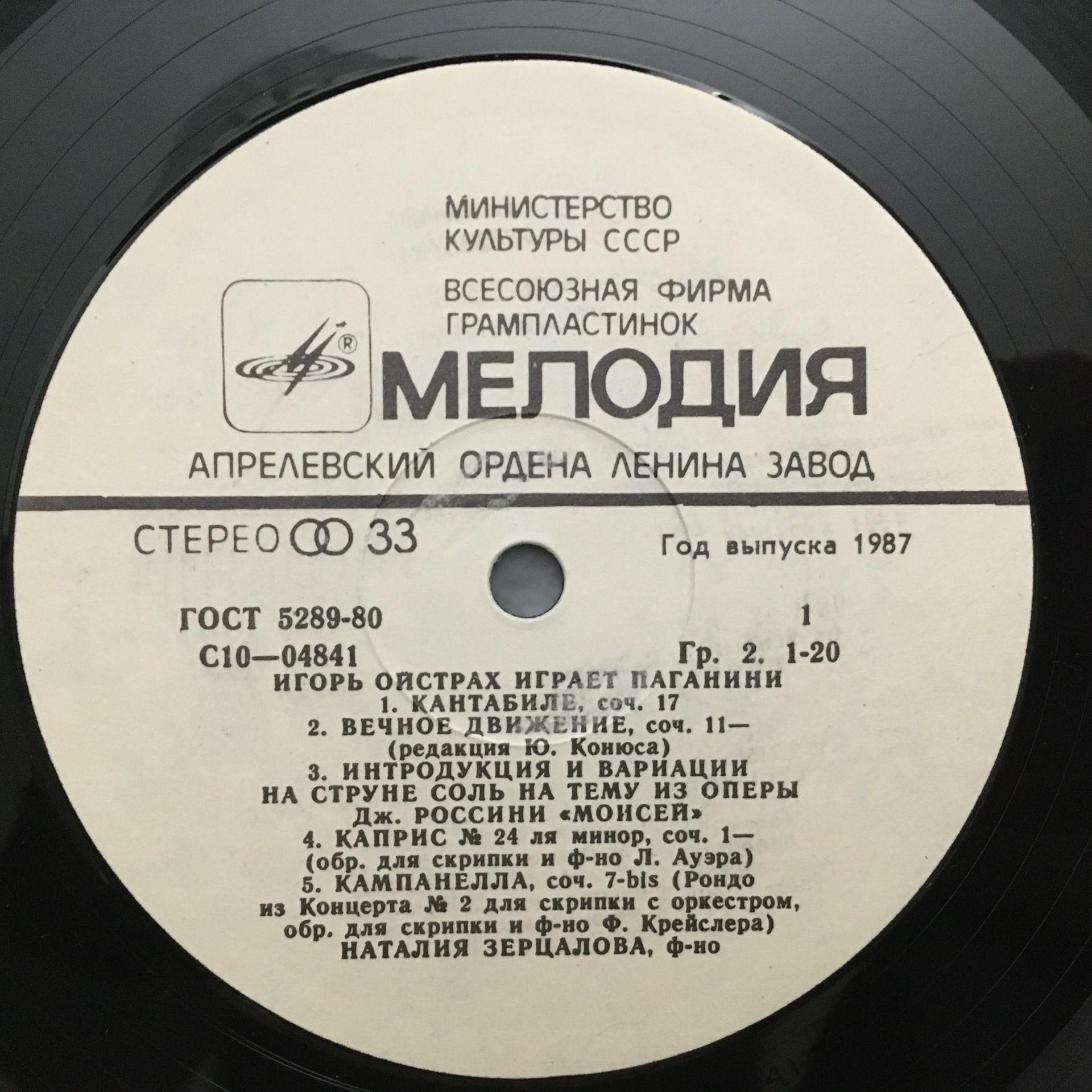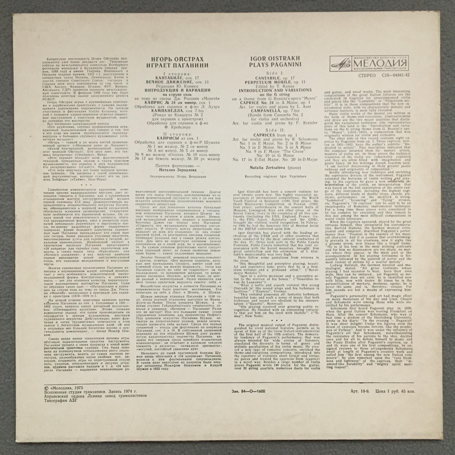 T766 Oistrakh plays Paganini Zertsalova Piano Melodiya C10-04841-42 Stereo