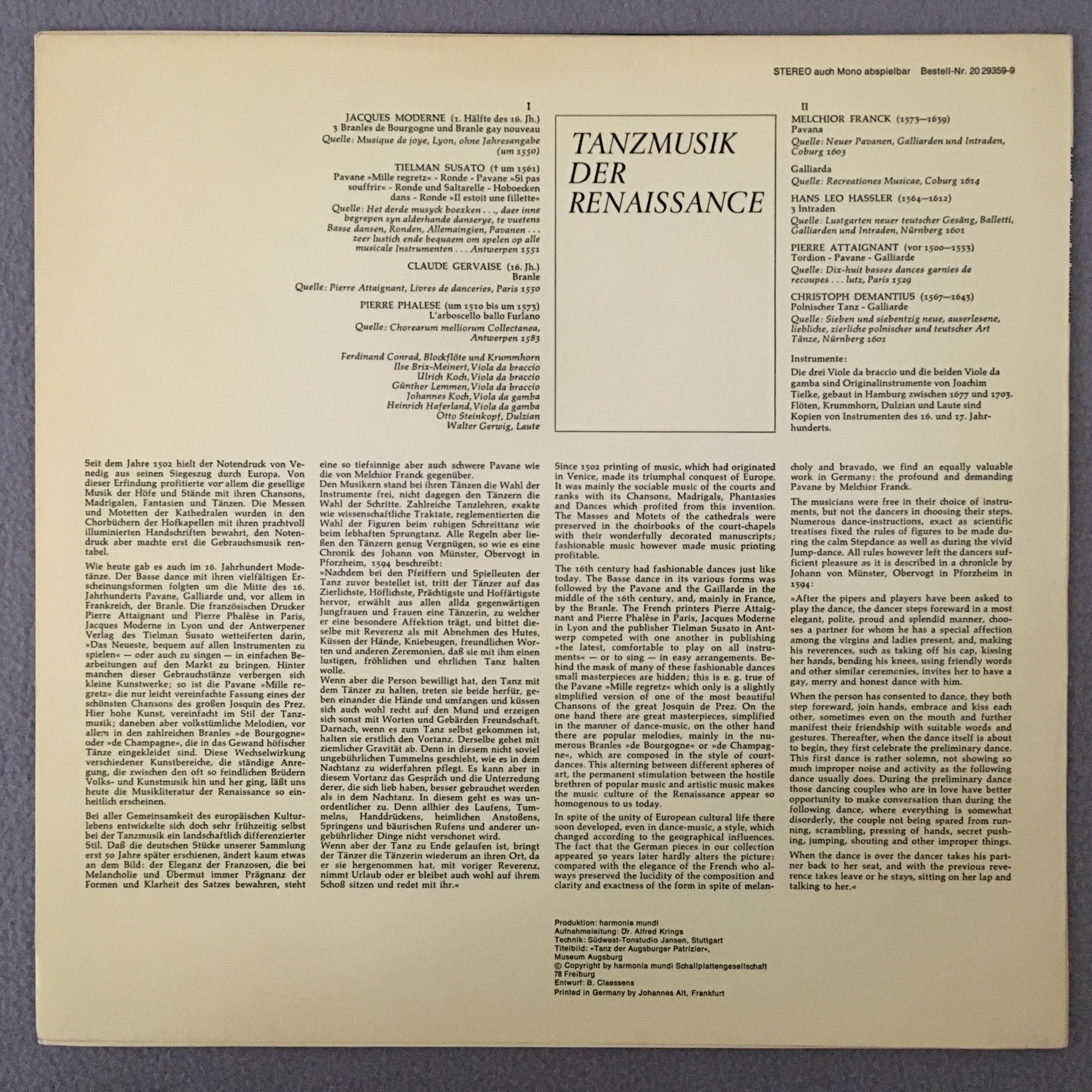 J401 Dance Music Renaissance Conrad Koch Collegium Aureum HM 20 29359-9 Stereo