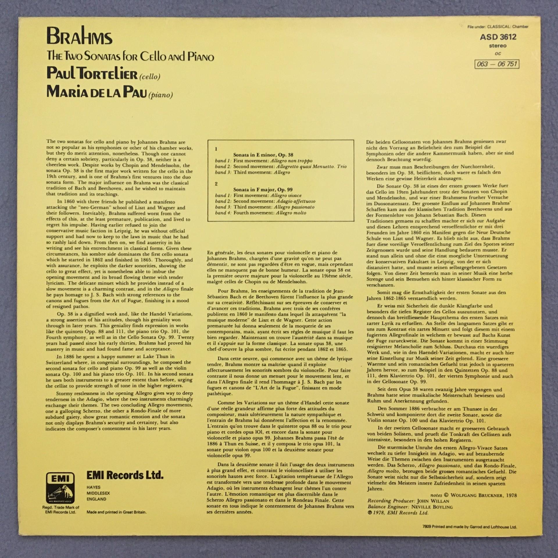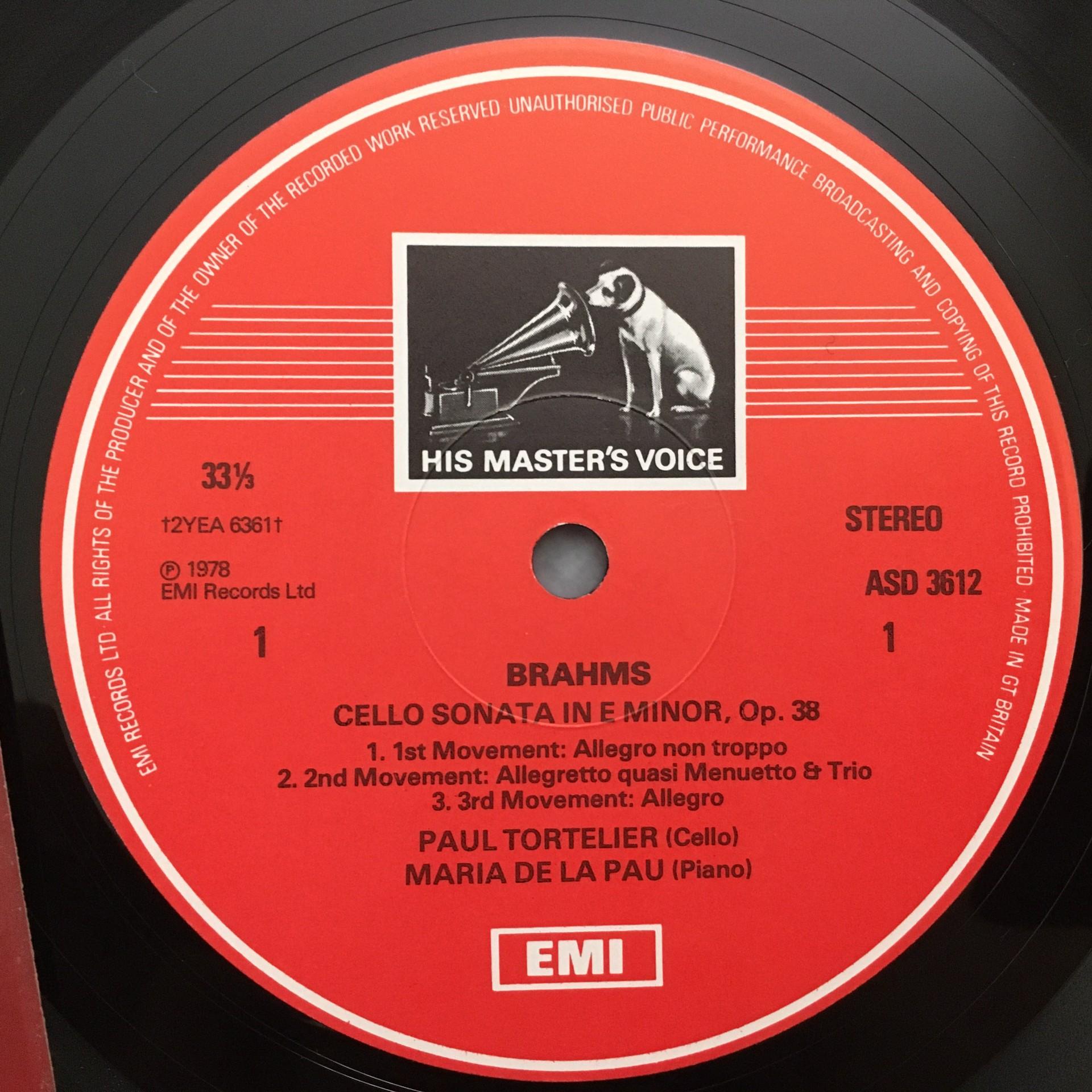 T862 Brahms Cello & Piano Sonatas Tortelier De La Pau EMI ASD 3612 Stereo