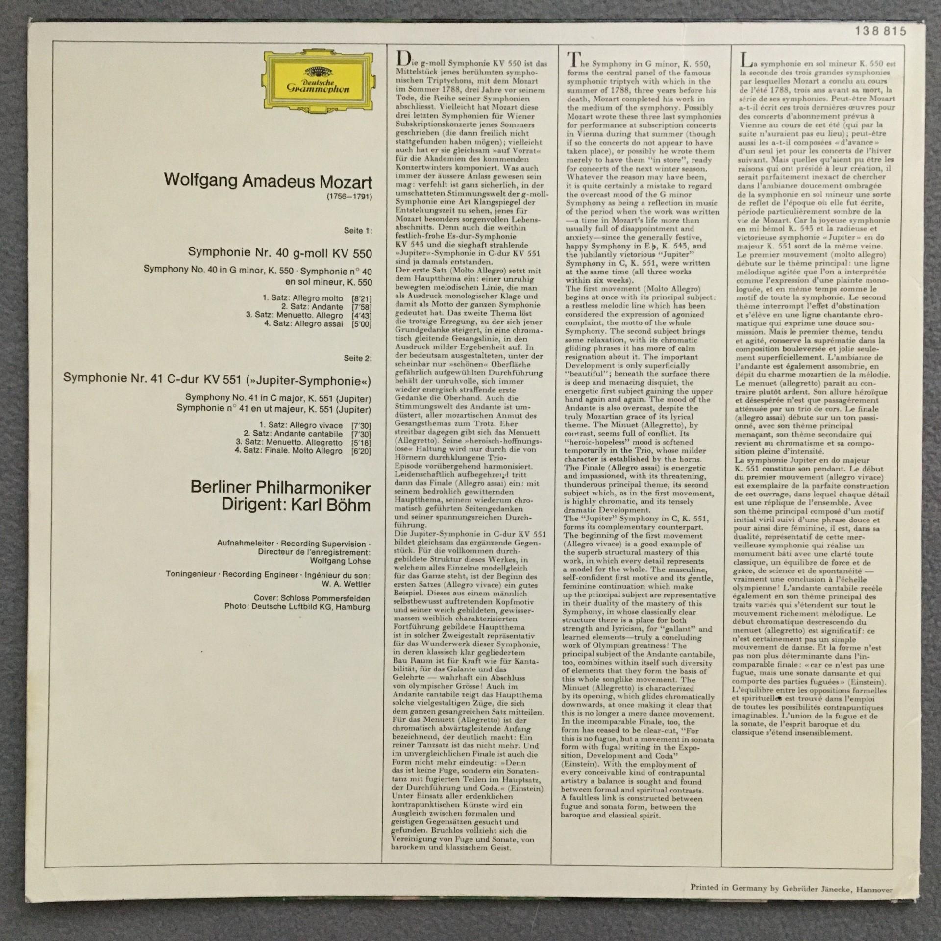 T888 Mozart Symphonies No.40 & No.41 Bohm DGG 138 815 Stereo