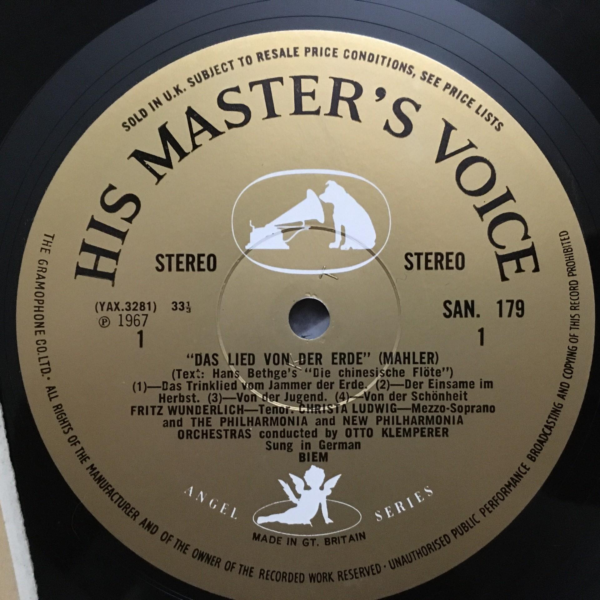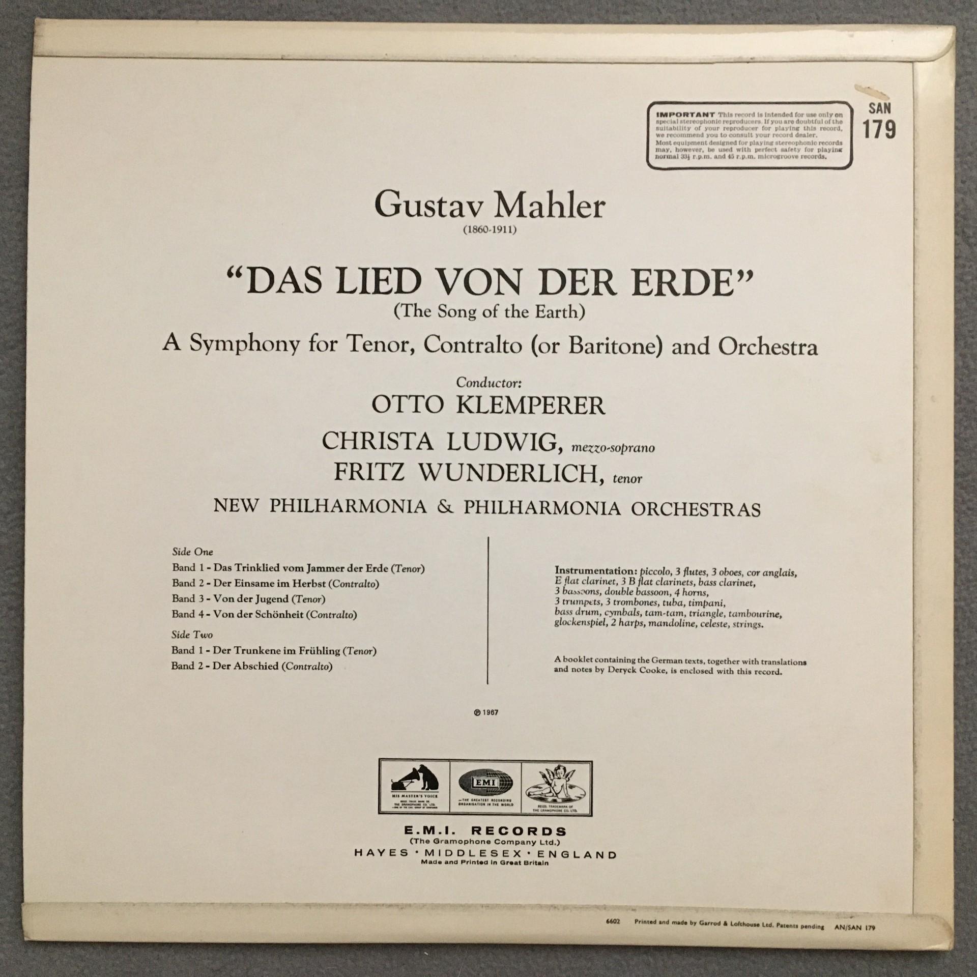 T889 Mahler Song of the Earth Wunderlich Ludwig Klemperer EMI SAN 179 Stereo