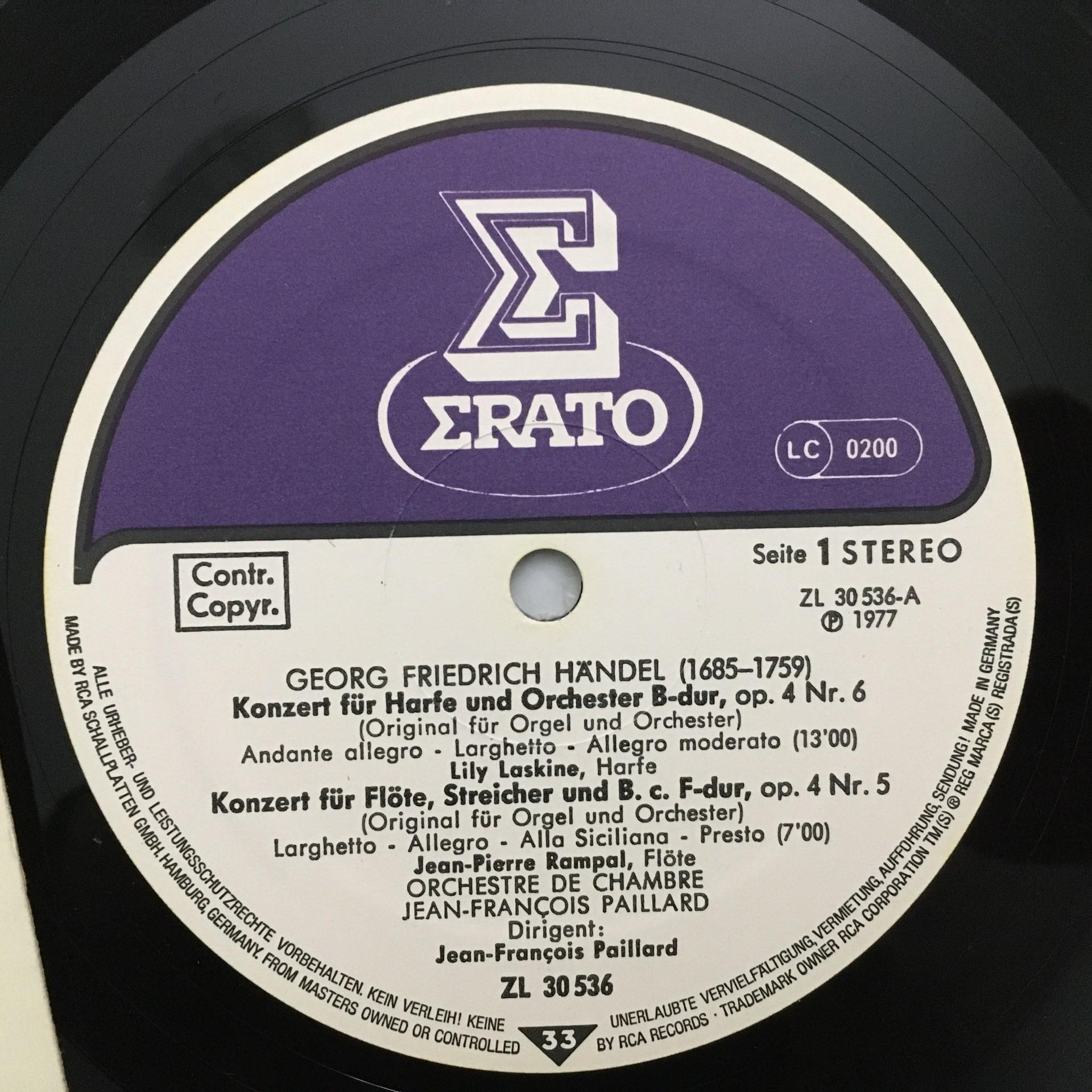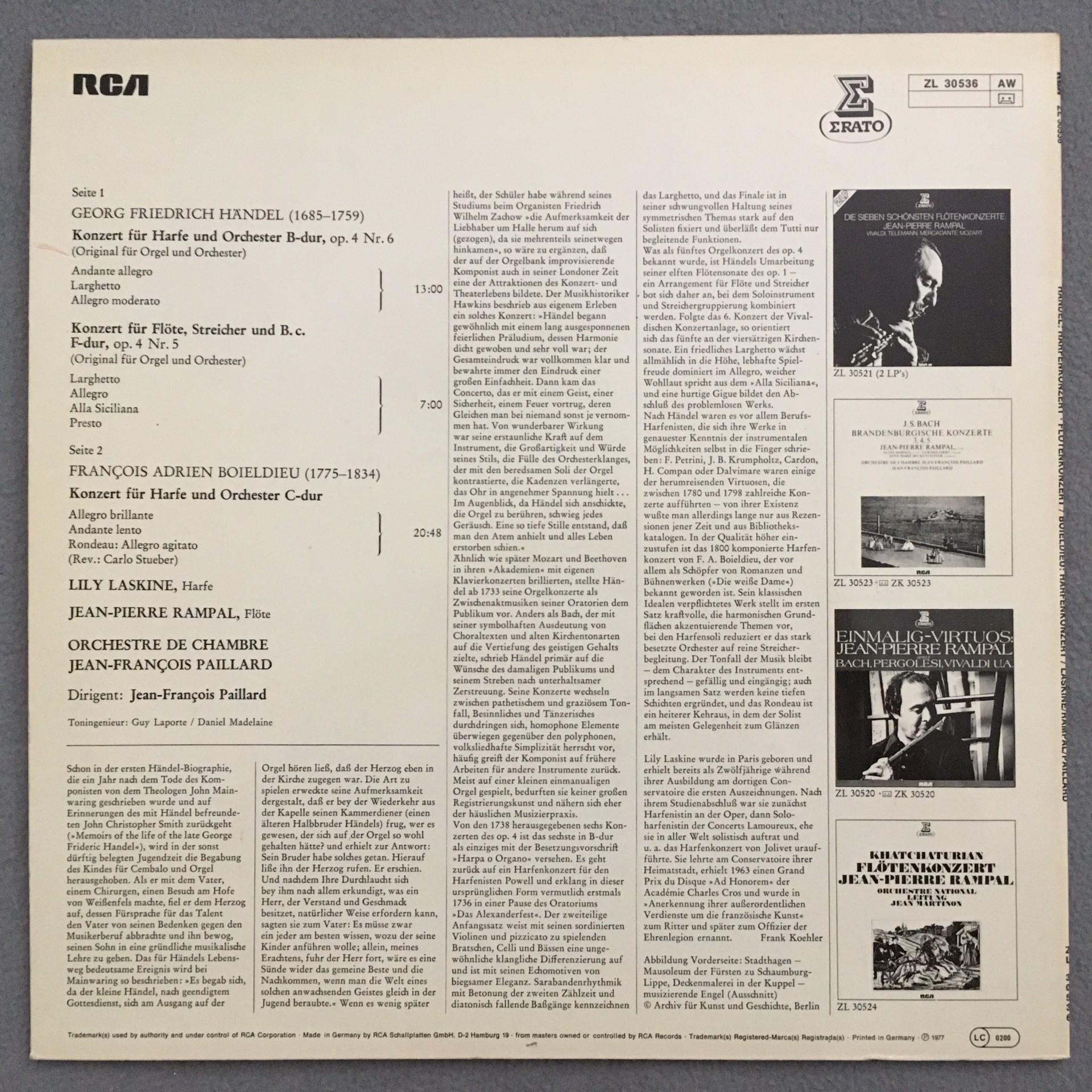 T919 Harp Concertos Boieldieu Handel Rampal Paillard Erato ZL 30 536 Stereo