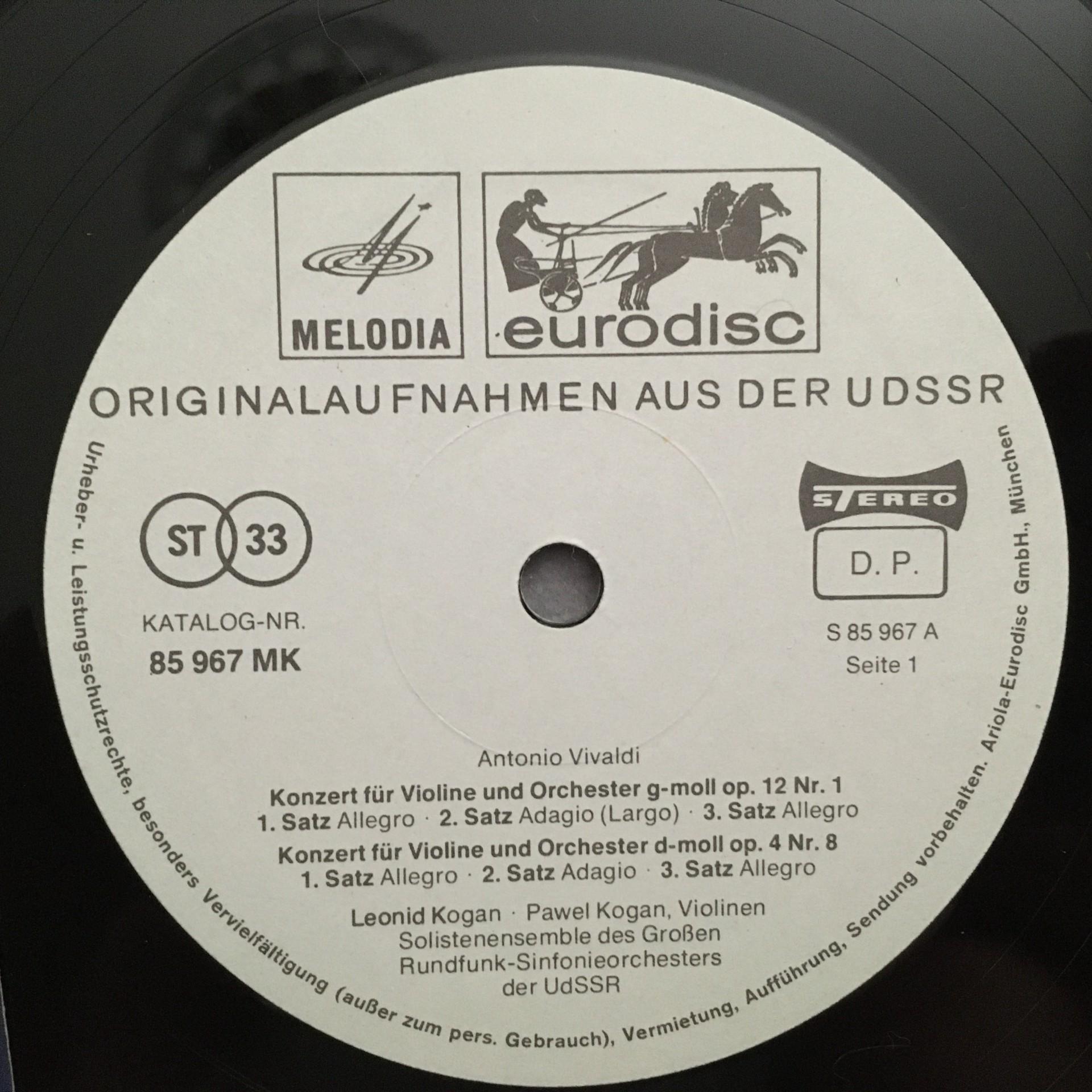 T996 Vivaldi Violin Concertos Gilels L. & P. Kogan Eurodisc 85 967 MK Stereo