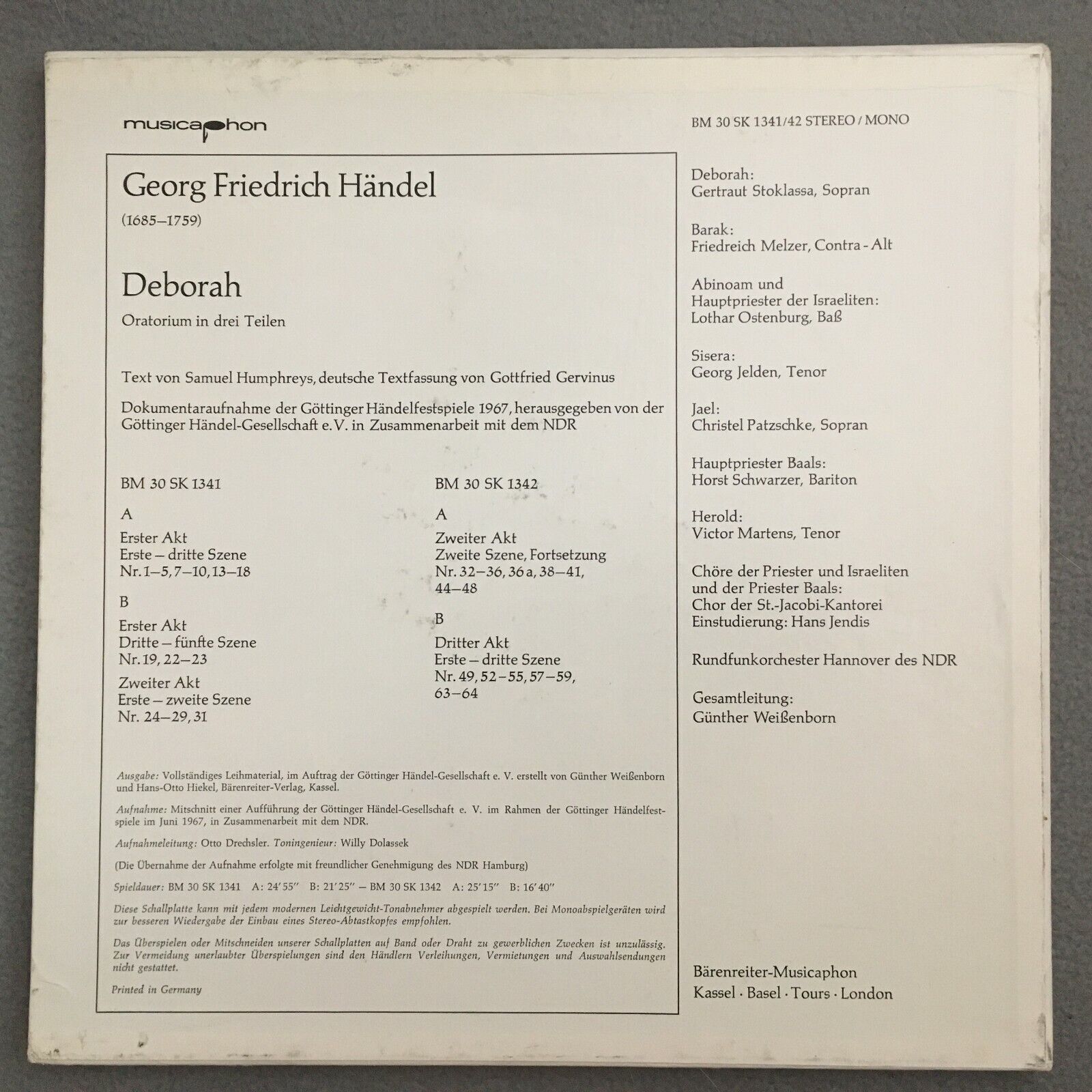 B276 Handel Deborah Melzer Weißenborn 2LP Musicaphon BM 30 SK 1341/42 Stereo