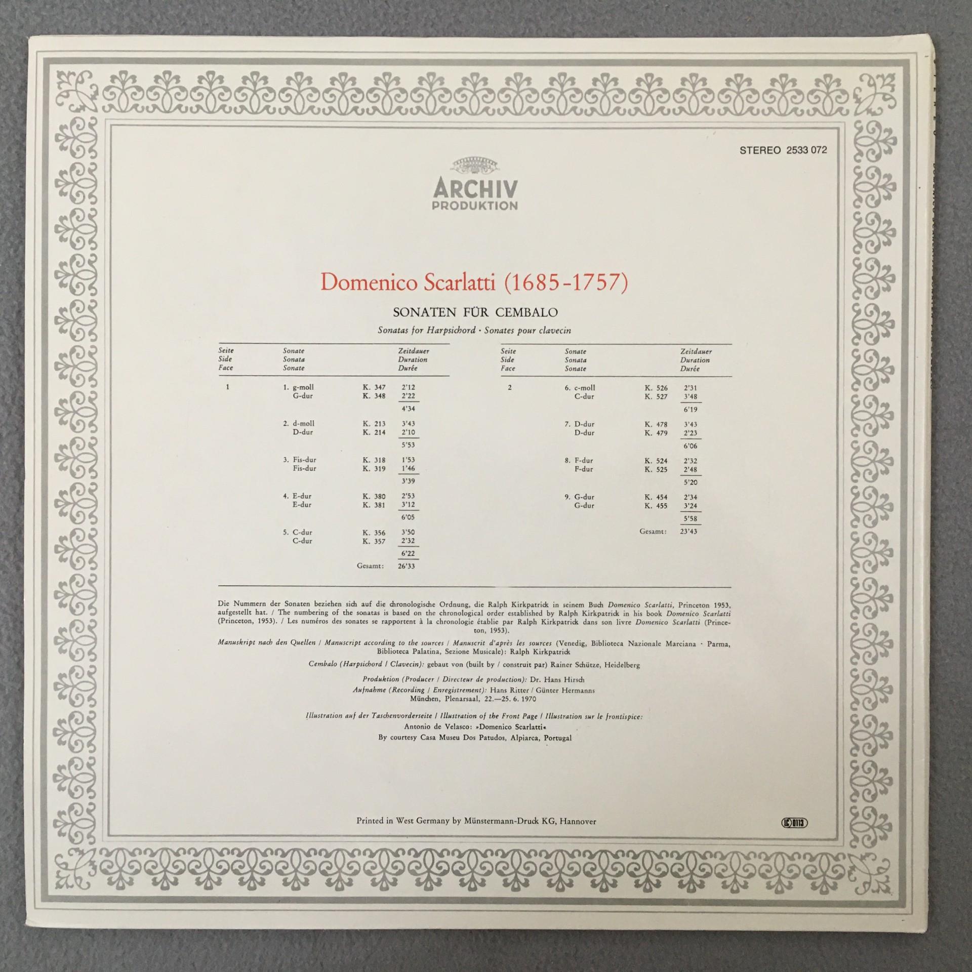 J811 Scarlatti Sonatas for Harpsichord Kirkpatrick DGG Archiv 2533 072 Stereo