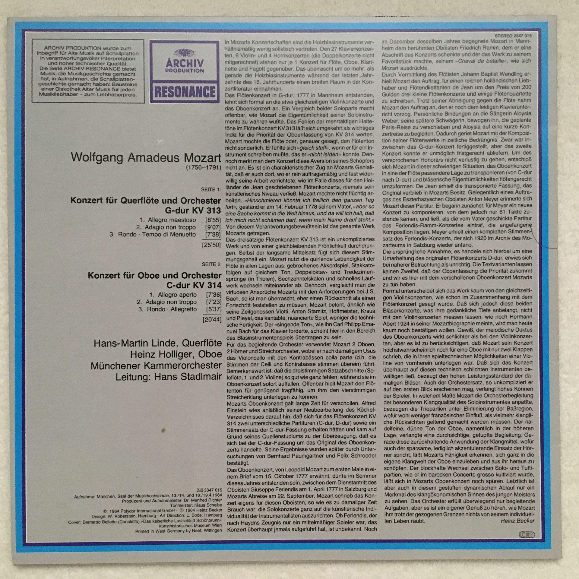 U094 Mozart Concertos Linde Holliger Stadlmair DGG Archiv 2547 015 Stereo