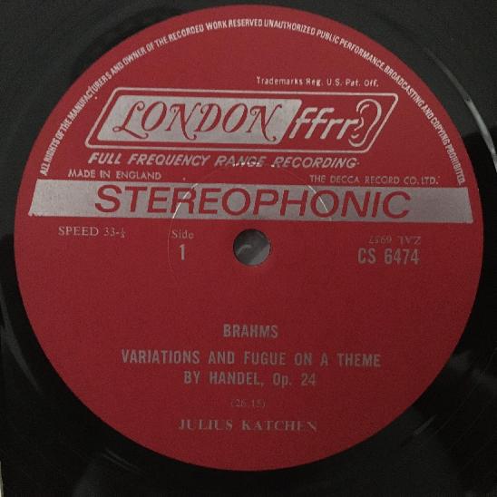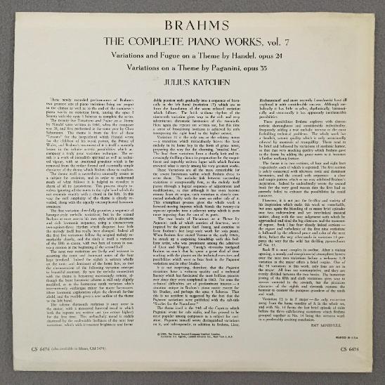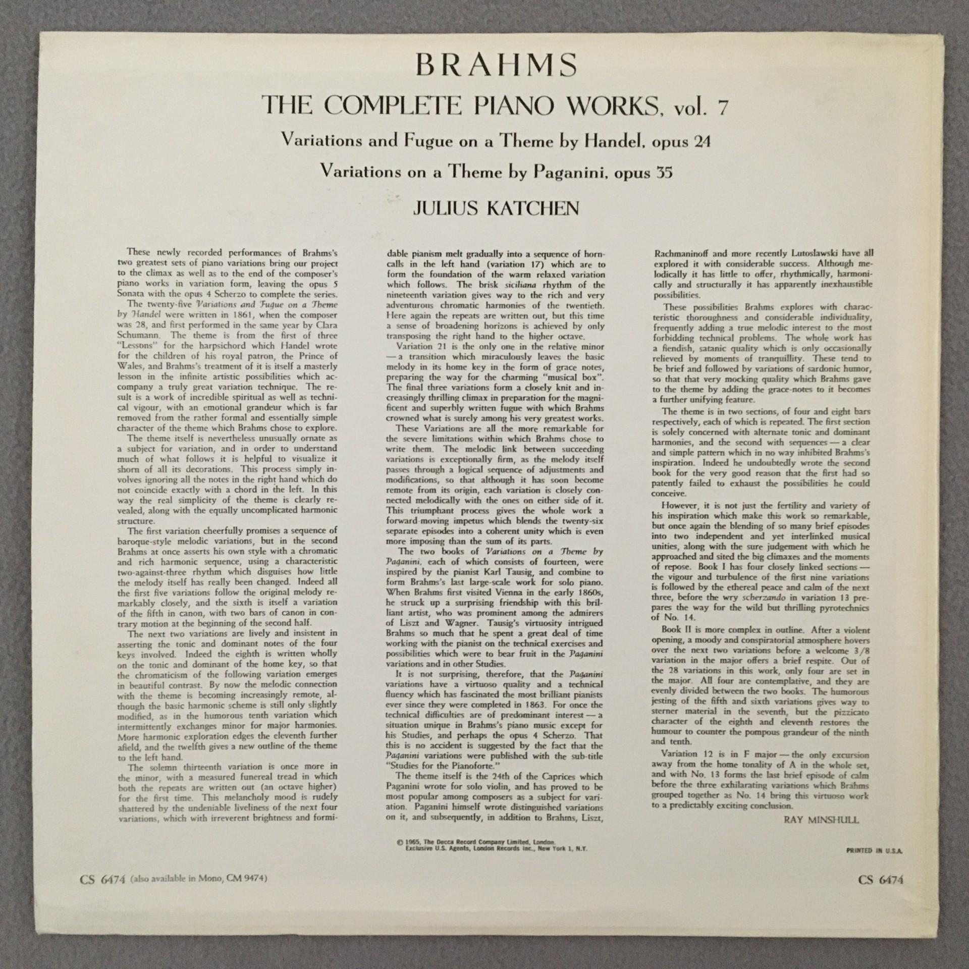 J858 Brahms The Complete Piano Works Vol.7 Katchen London CS 6474 Stereo