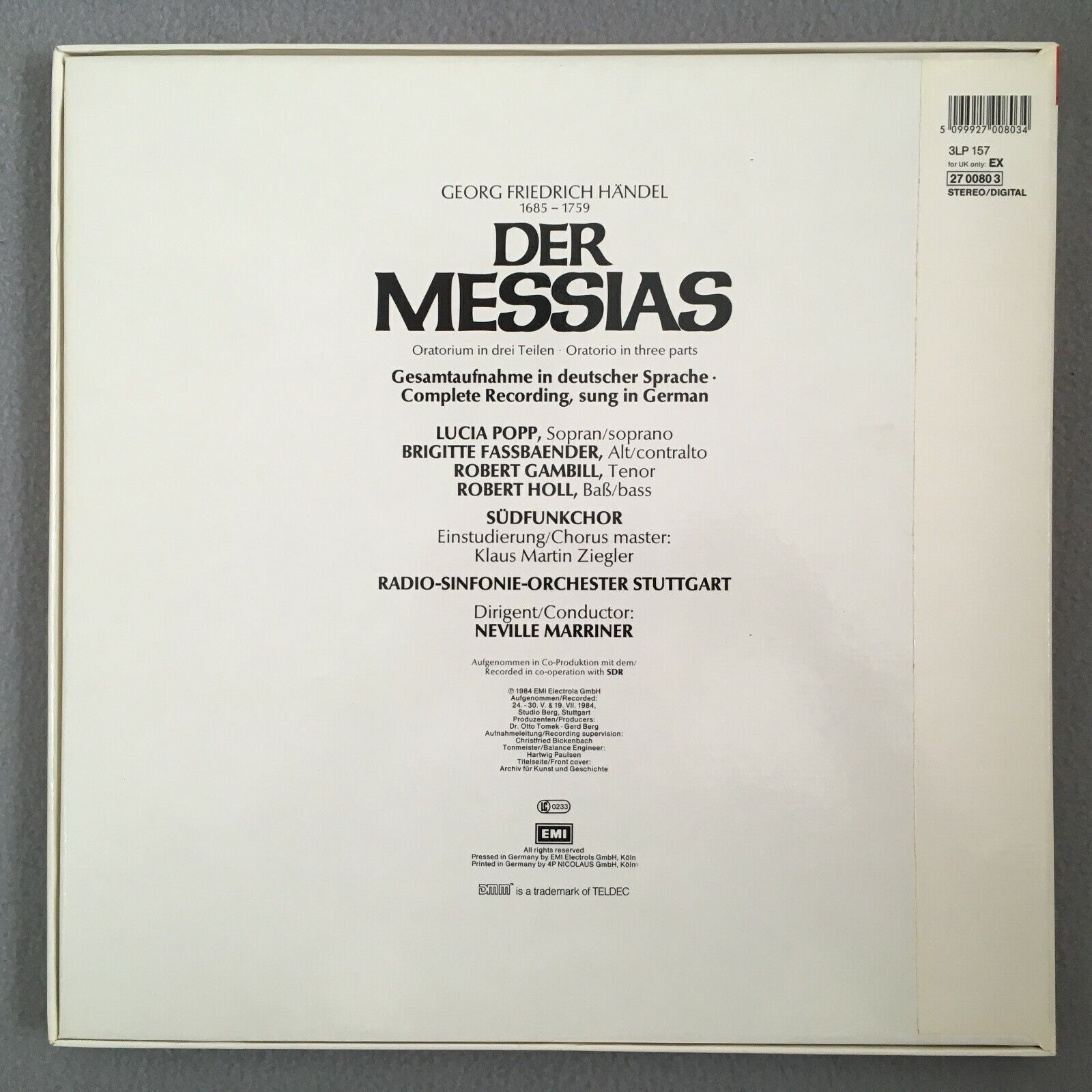 C663 Handel The Messiah Popp Holl Marriner 3LP EMI 157 27 0080 3 Digital Stereo