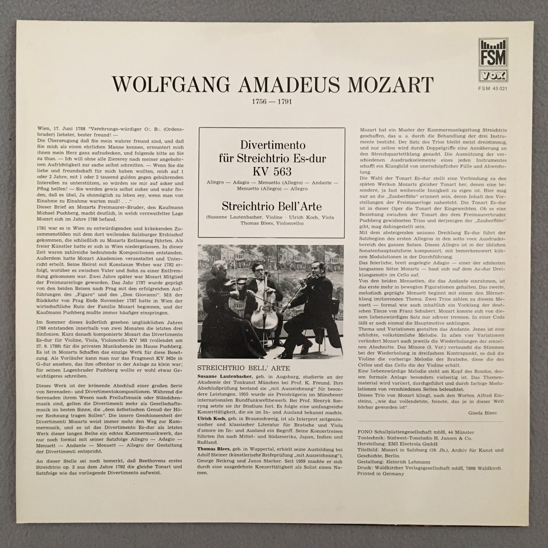 P143 Mozart Divertimento String Trio Bell´Arte Lautenbacher FSM 43 021 Stereo