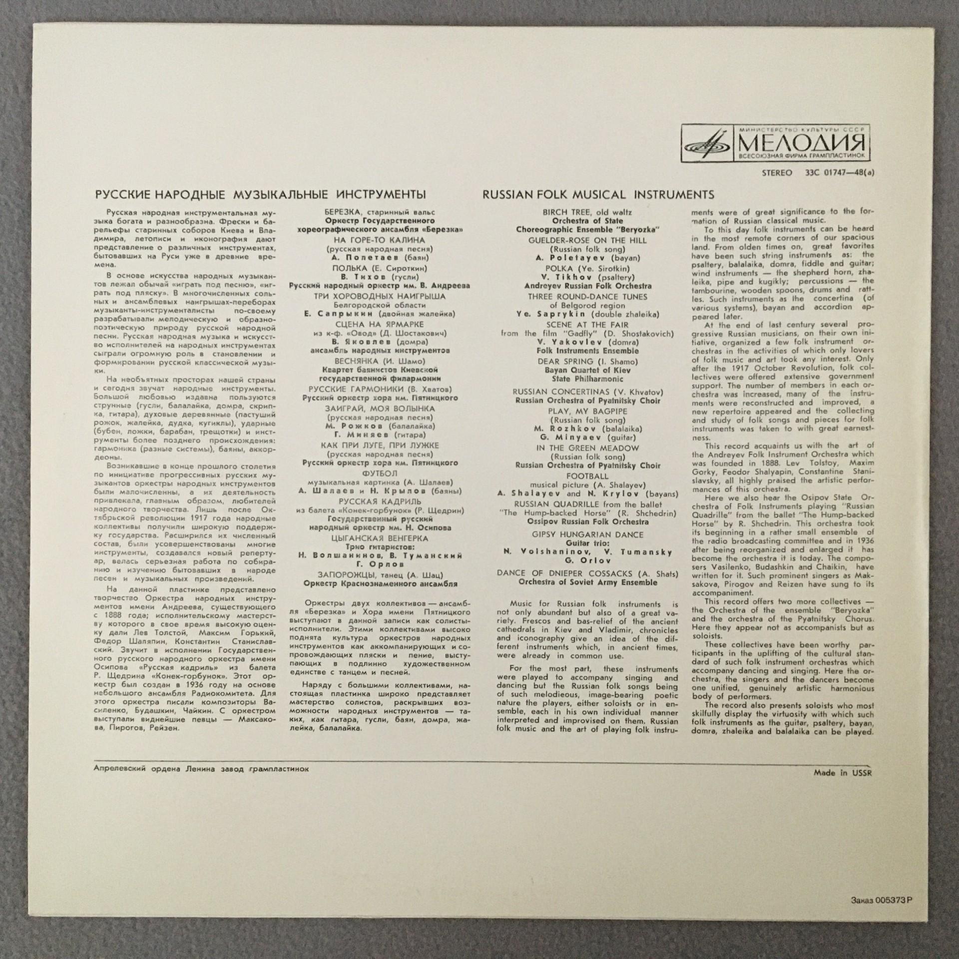 P154 Russian Folk Musical Instruments Melodiya 33C 01747-48 Stereo