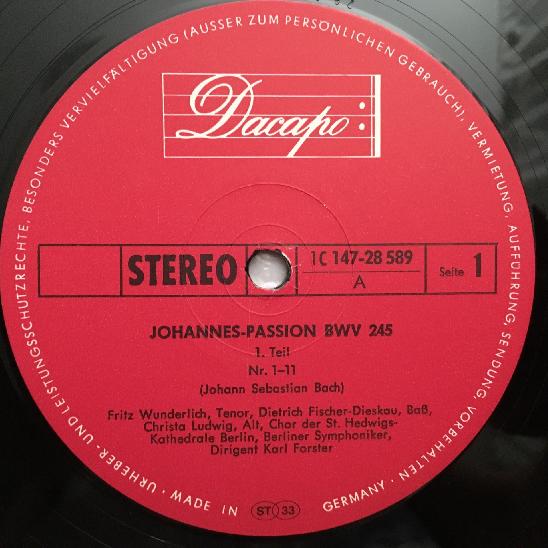 C021 Bach St. John Passion Wunderlich Forster 3LP Dacapo 1 C 147-28 589/91 St