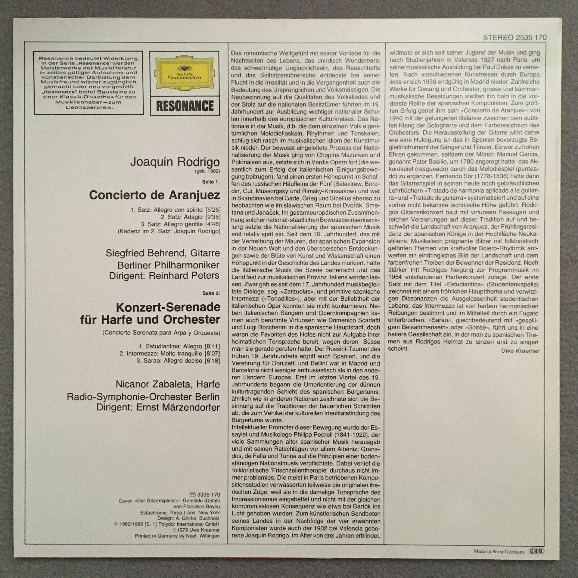 K028 Rodrigo Concertos Behrend Guitar Zabaleta Harp Peters DGG 2535 170 Stereo