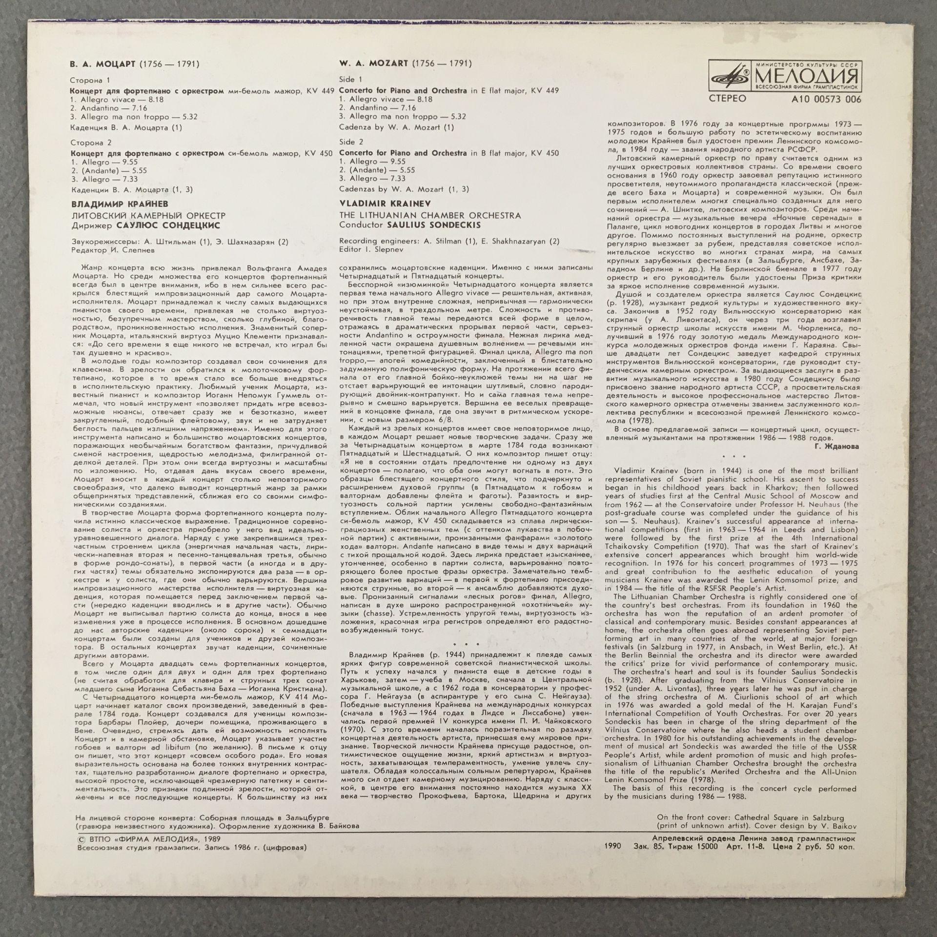 K042 Mozart Piano Concertos Krainev Sondeckis Melodiya A10 00573 006 Stereo