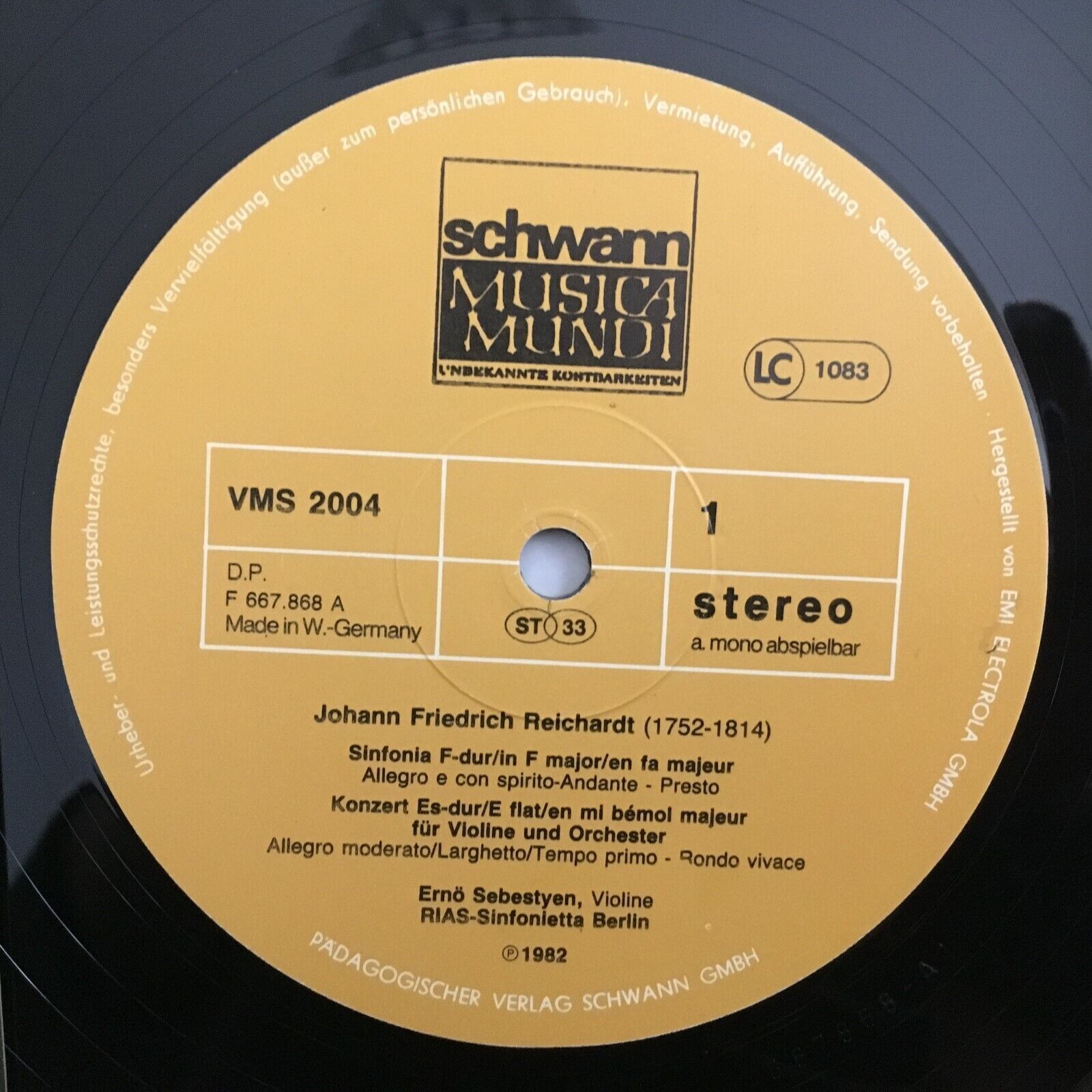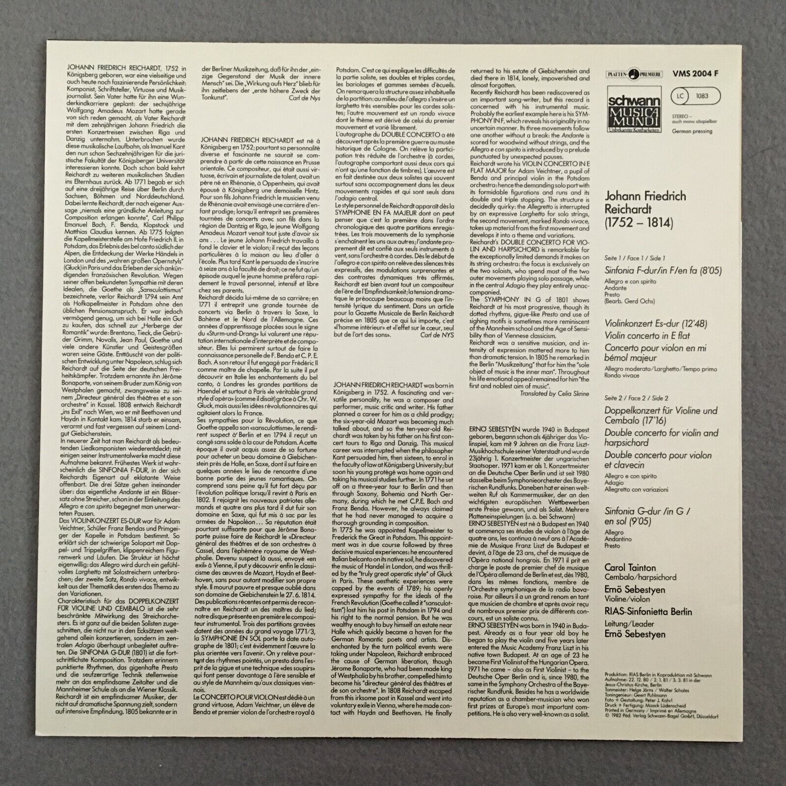 J965 Reichardt Violin Concerto Tainton Sebestyen Schwann VMS 2004 F Stereo