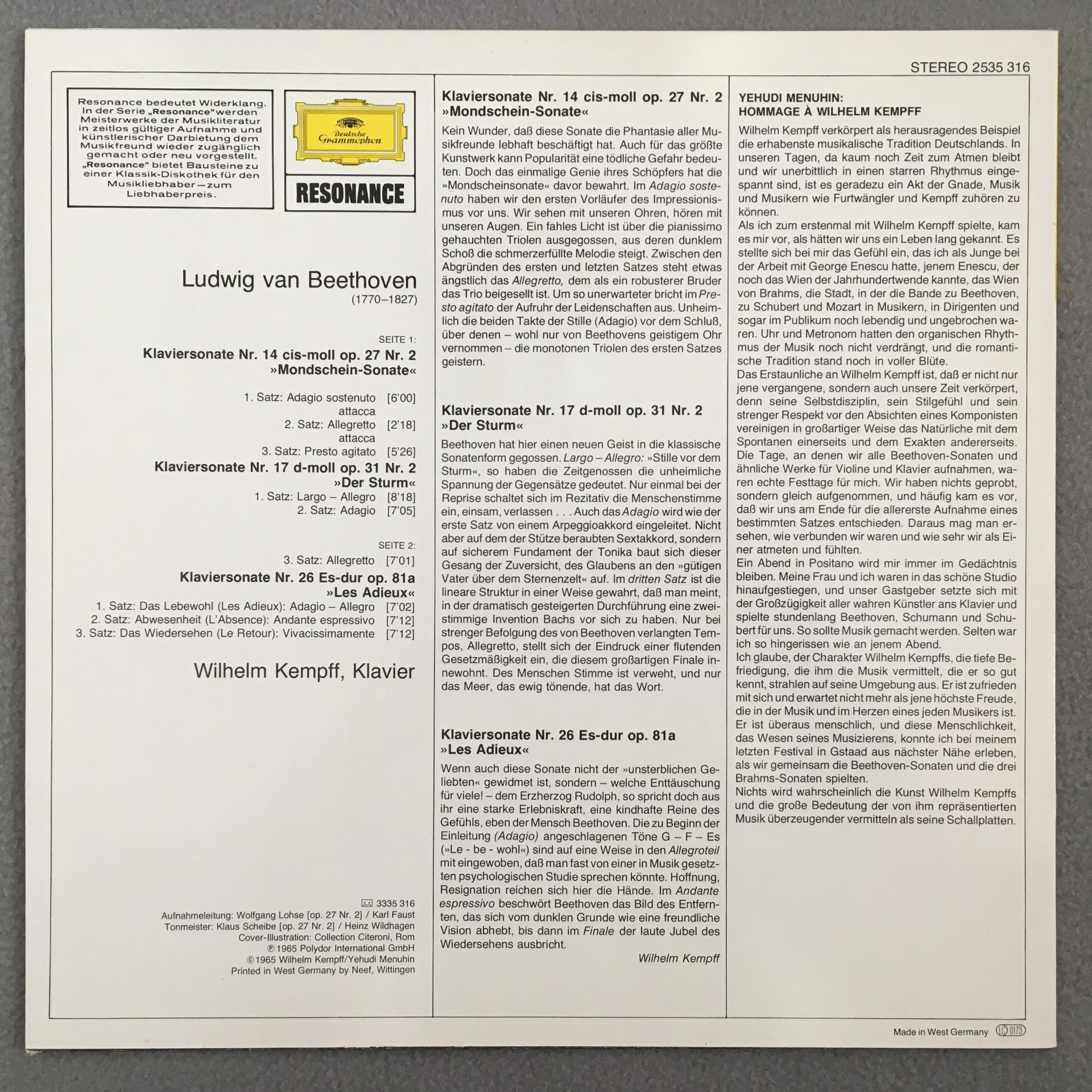 K081 Beethoven Piano Sonatas Kempff DGG 2535 316 Stereo