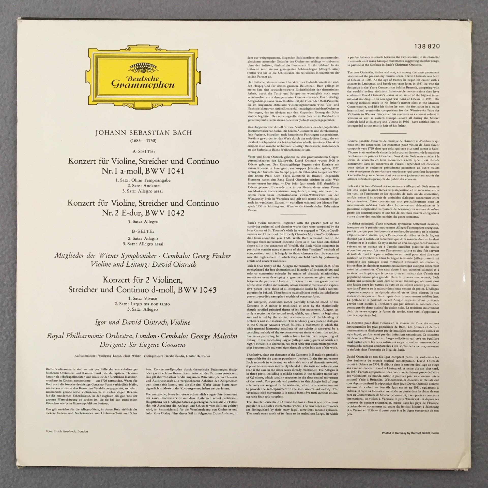 K208 Bach Violin Concertos I. & D. Oistrakh Malcolm Gossens DGG 138 820 Stereo