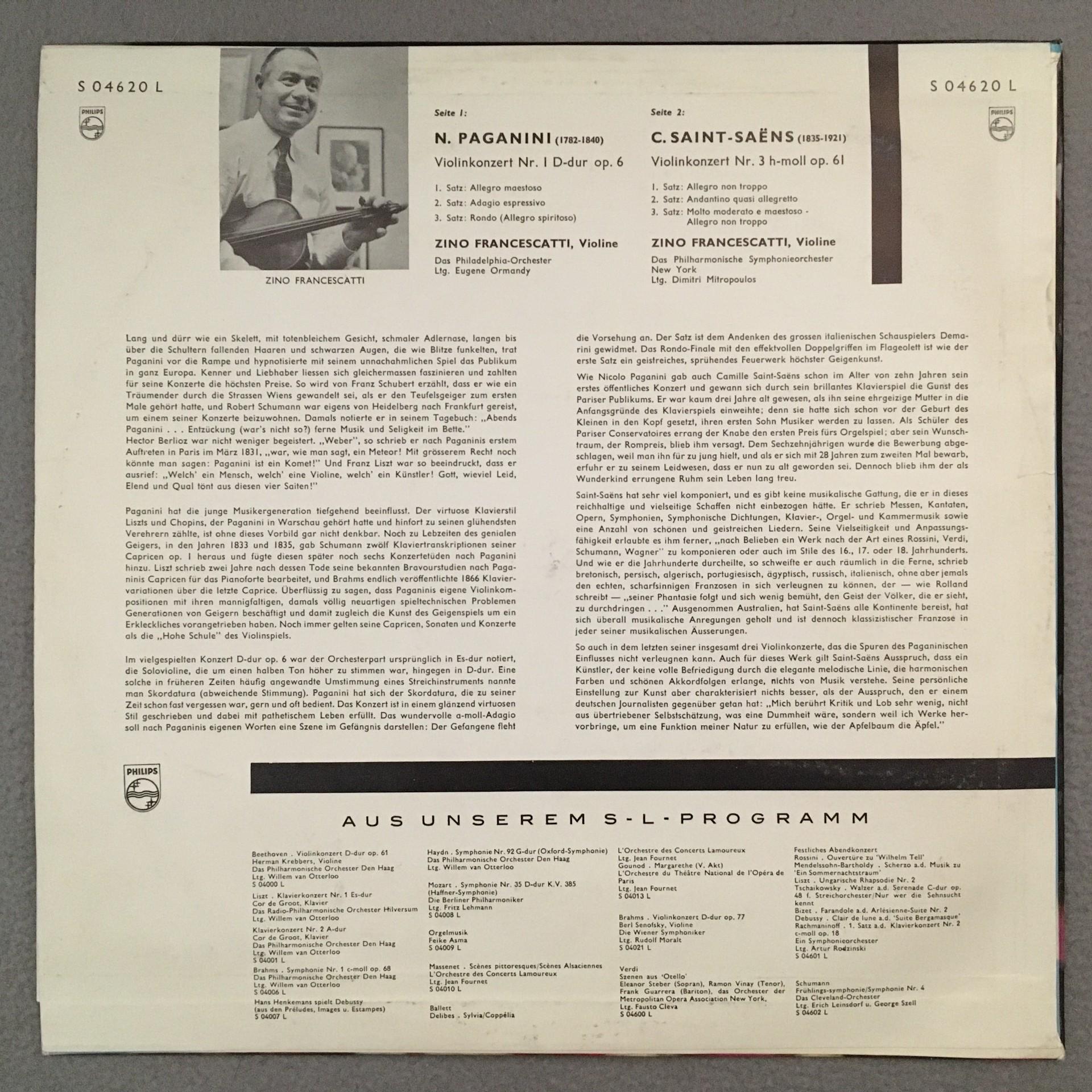 K237 Paganini Saint-Saens Concertos Francescatti Philips S 04620 L Huf Cover