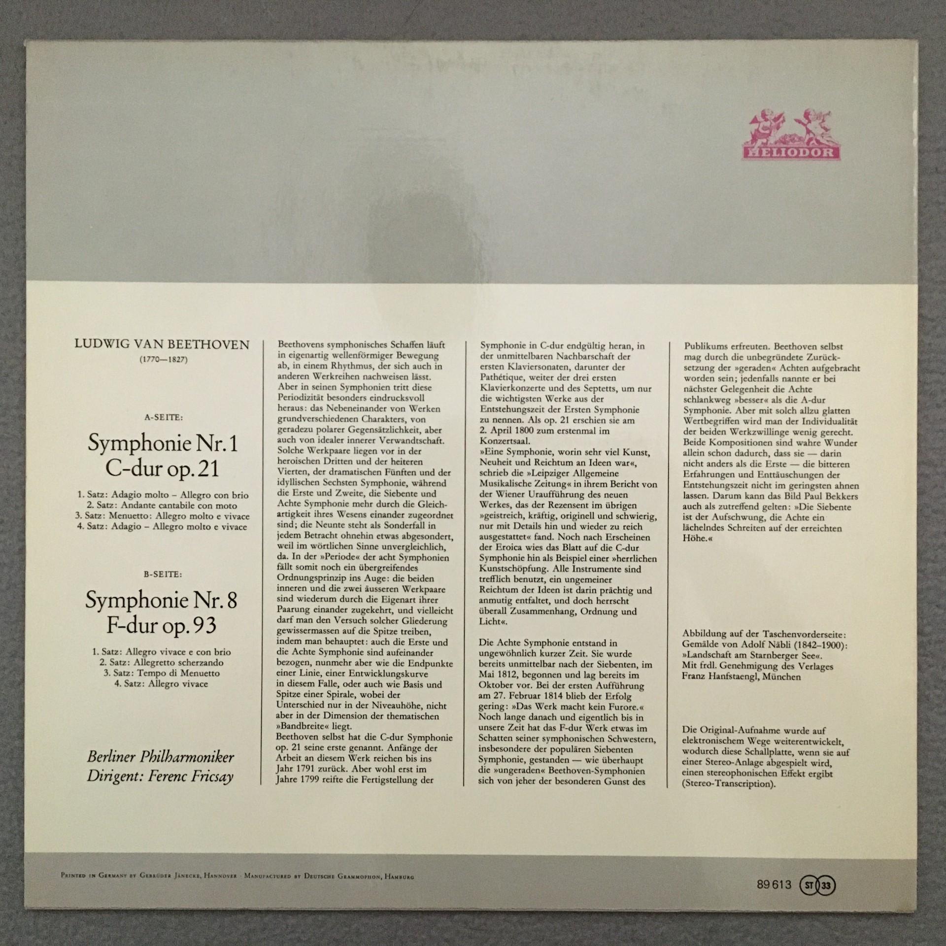 K290 Beethoven Symphonies No.1 & No.8 Fricsay BPO Heliodor 89 613 Stereo