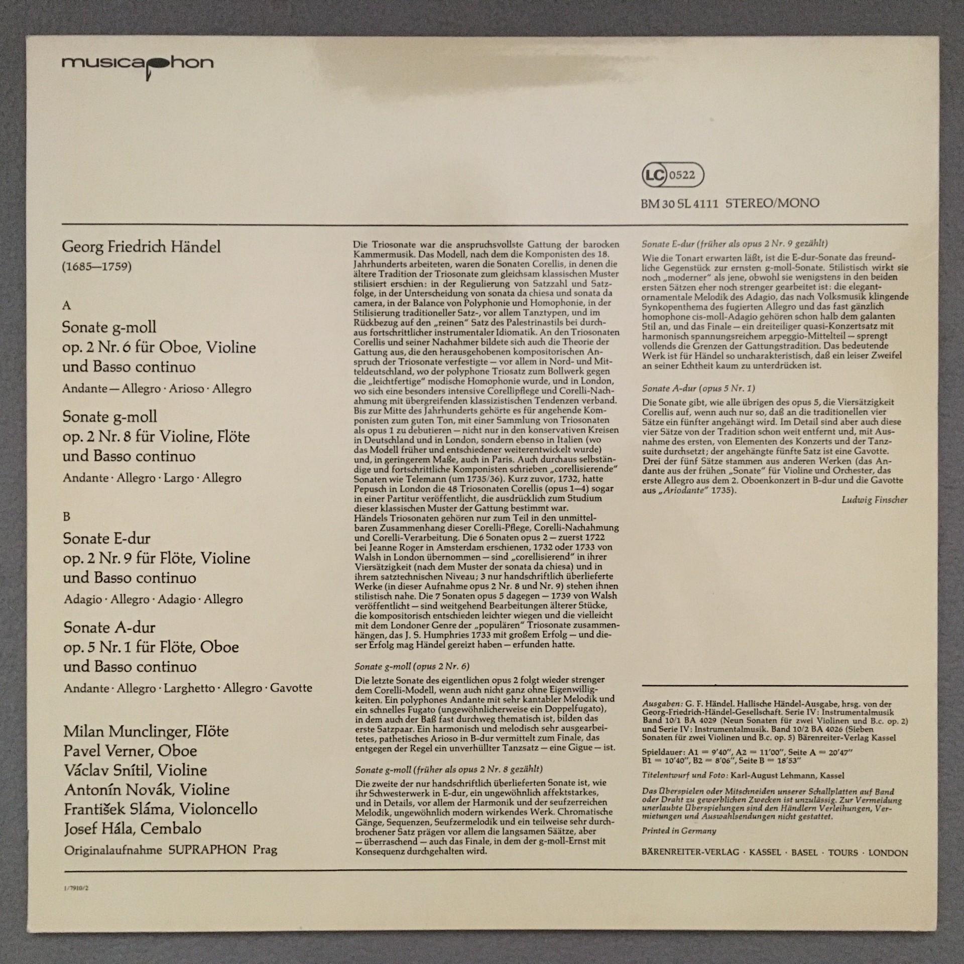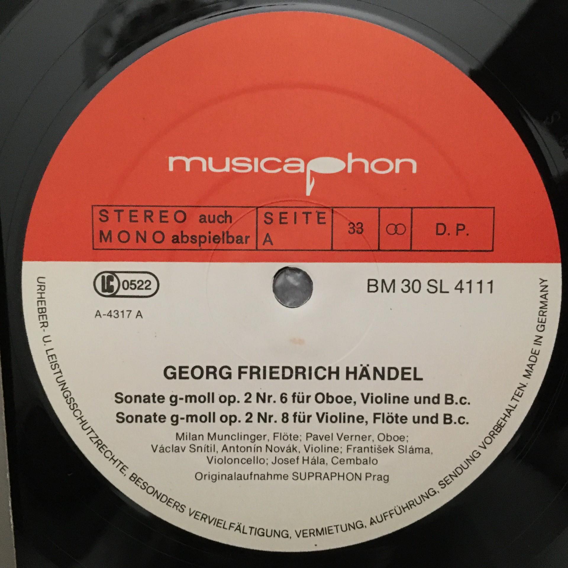 K398 Handel Trio Sonatas Munclinger Novak Hala Musicaphon BM 30 SL 4111 Stereo
