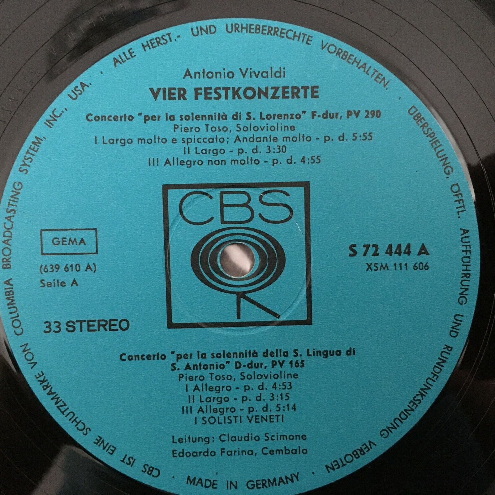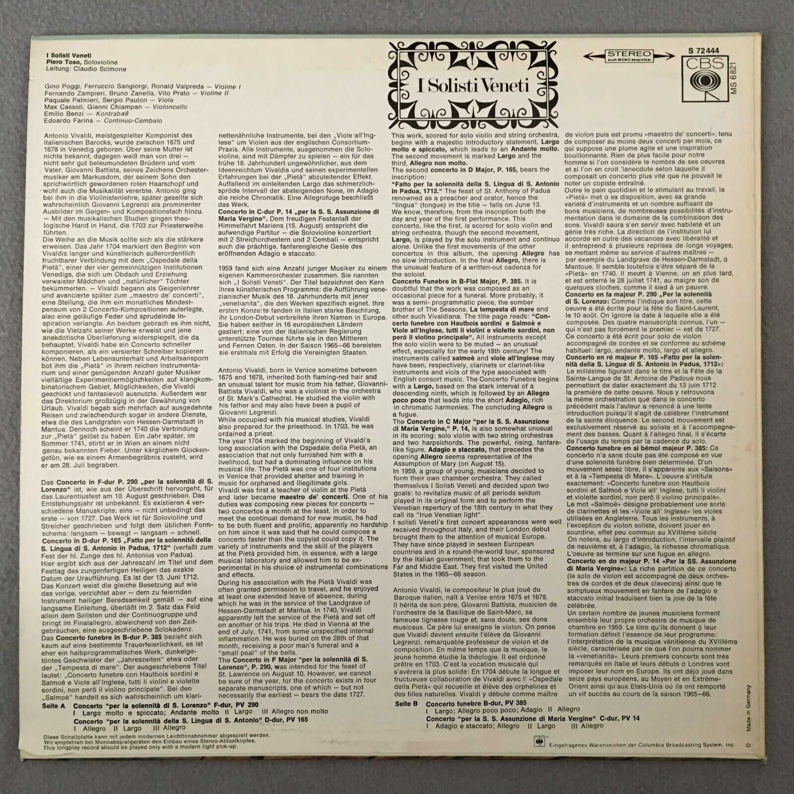 R706 Vivaldi 4 festive Concertos Scimone I Solisti Veneti CBS S 72 444 Stereo
