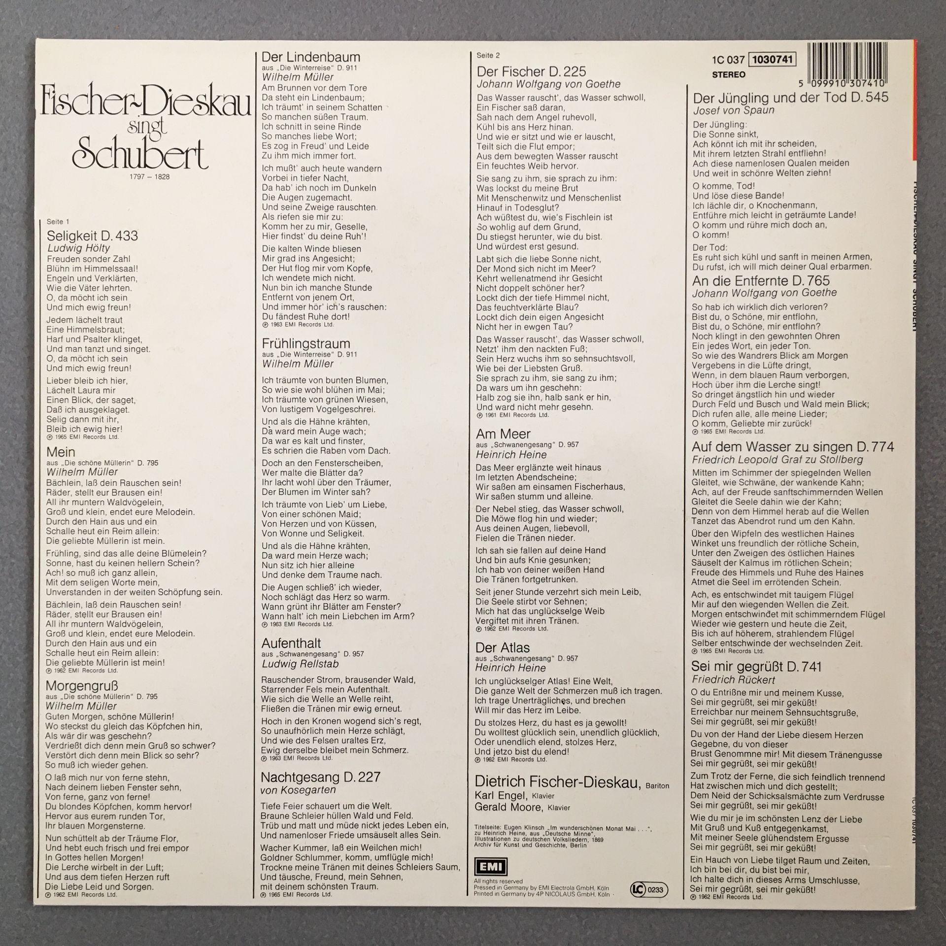 K474 Fischer-Dieskau sings Schubert Songs Moore Piano EMI 1C 037 1030741 Stereo