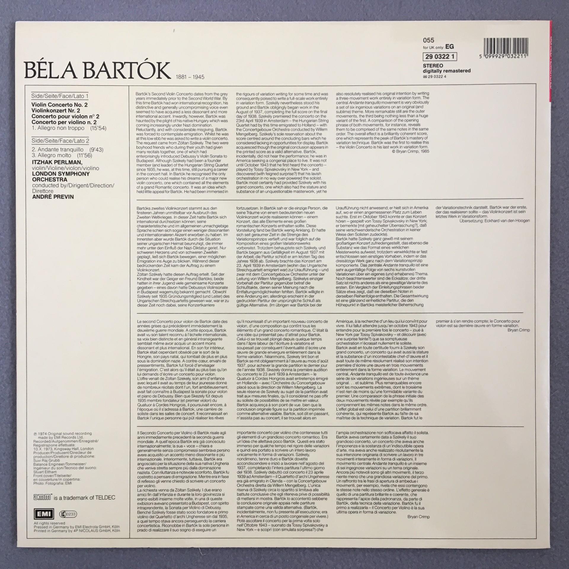 K480 Bartok Violin Concerto No.2 Perlman Previn EMI 055 29 0322 1 Digital Stereo