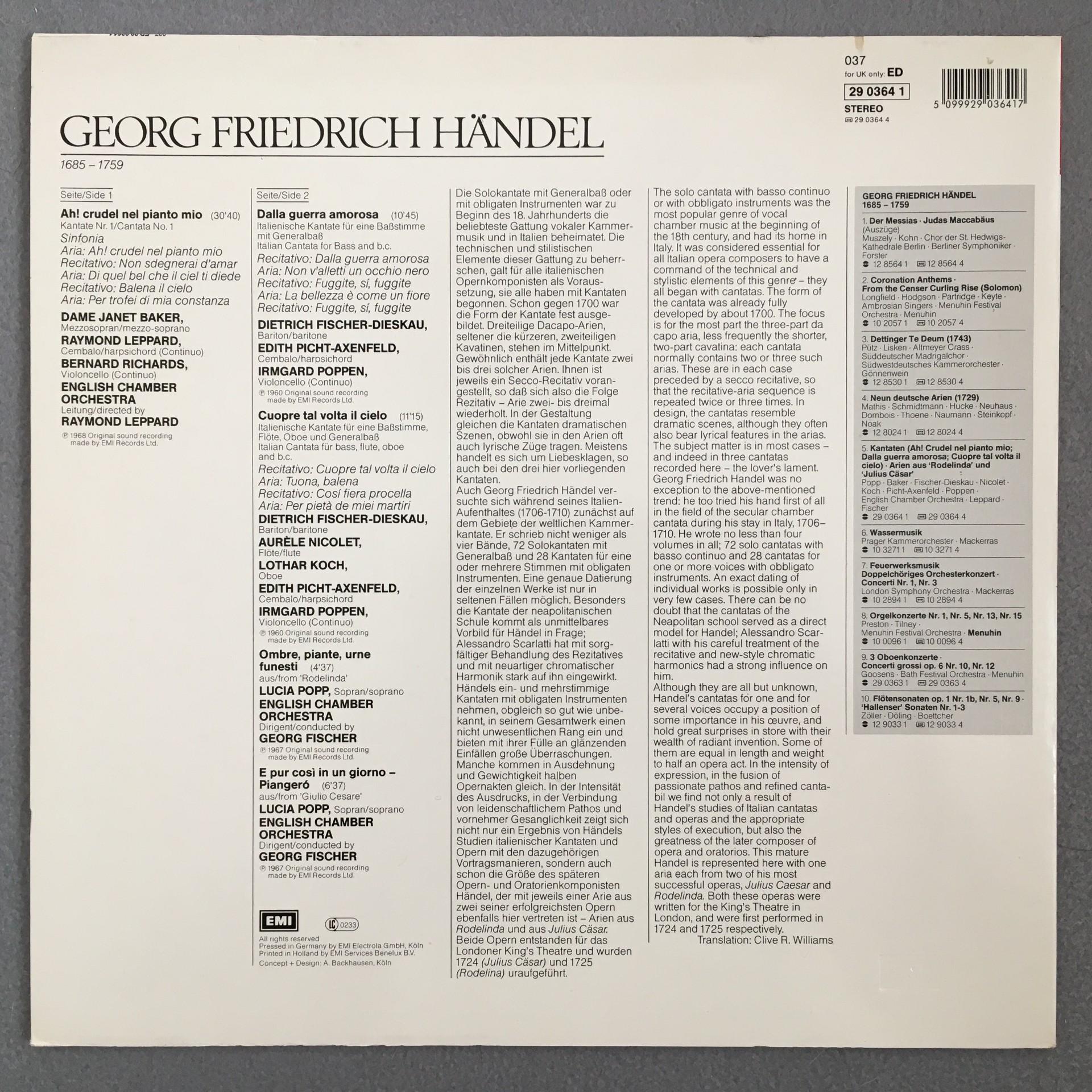 K481 Handel Cantatas & Arias Fischer-Dieskau Nicolet Fischer EMI 29 0364 1 Ste