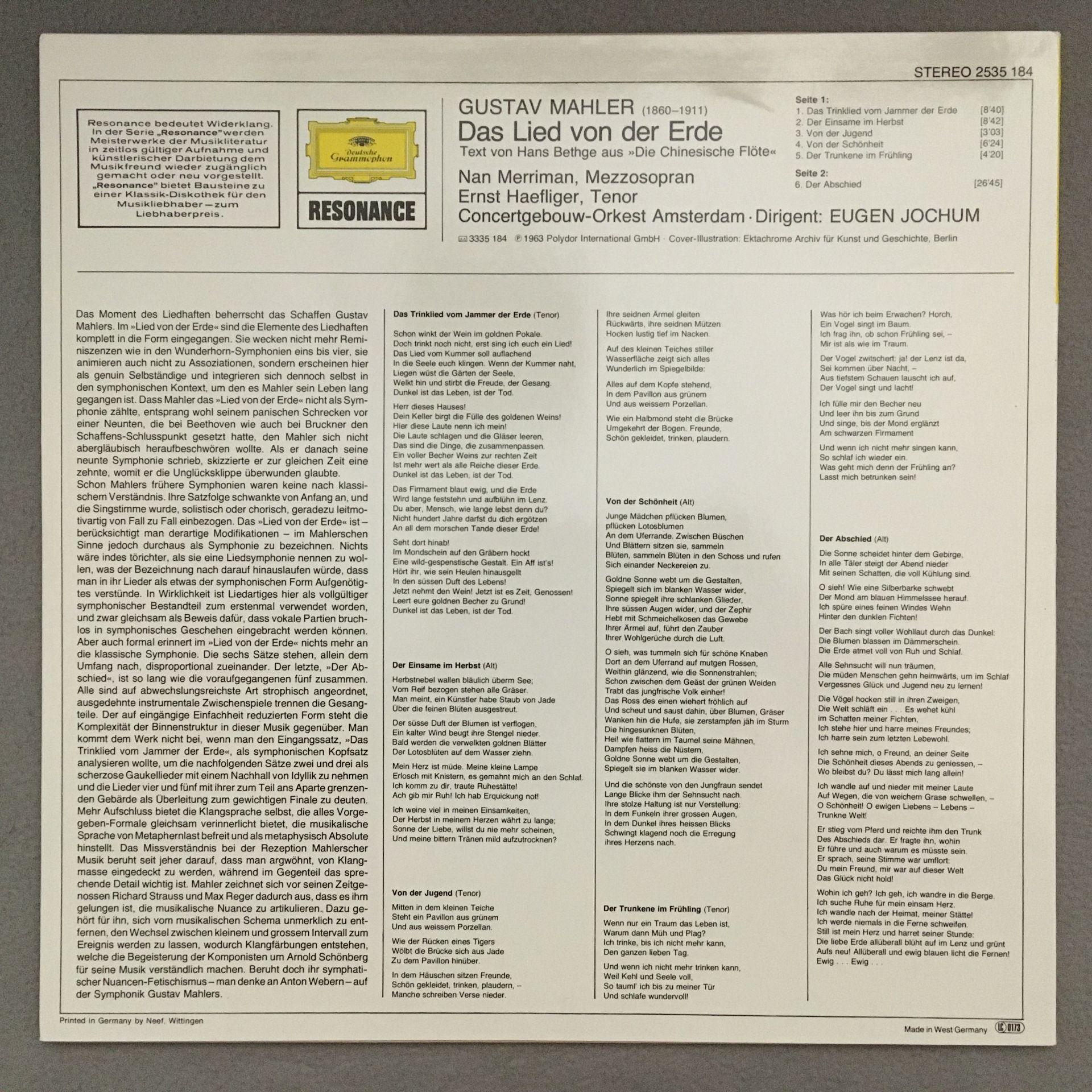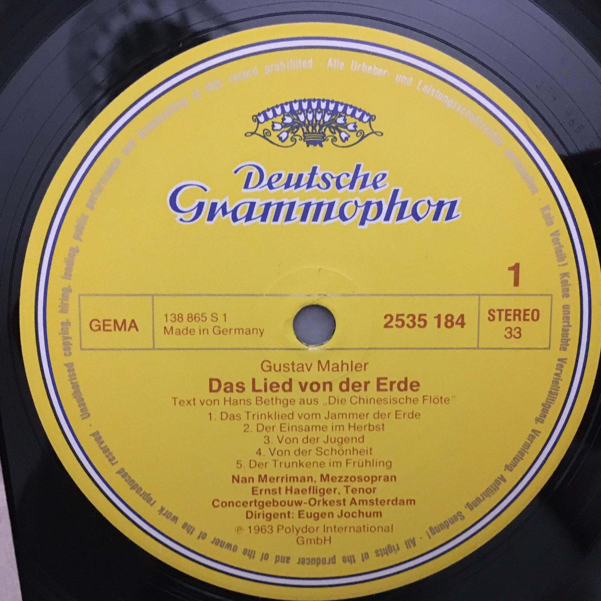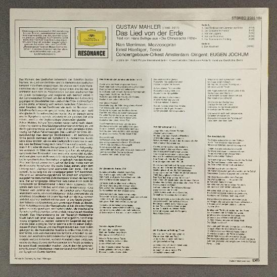 K494 Mahler Song of the Earth Merriman Haefliger Jochum DGG 2535 184 Stereo